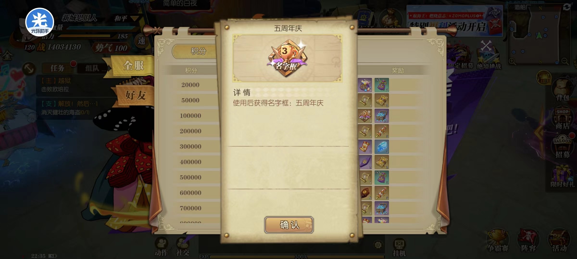 另外一个就是积分和排行榜的奖励,分数达到一定的值就能够直接领取奖励,这里面有个比较好的就是五周年的名字框