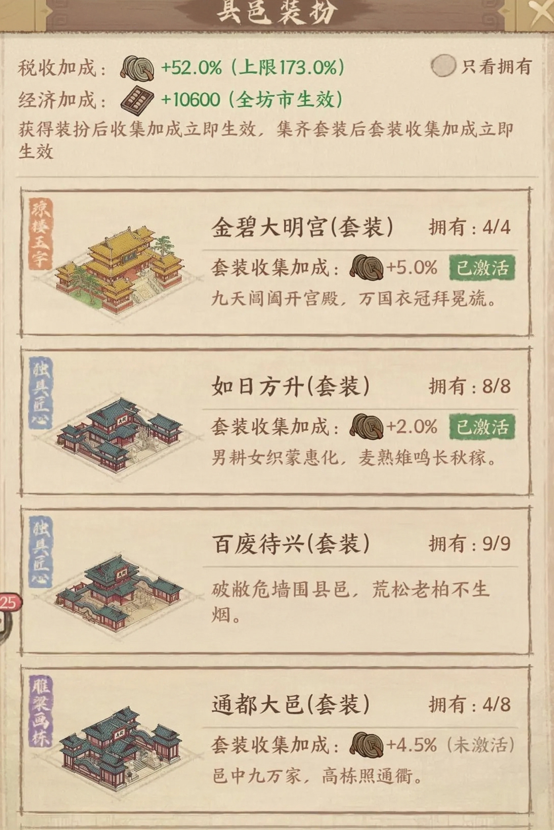 ②【县邑装扮】:解锁县邑装扮可以提升税收。收集套装加成也可以提高税收。
