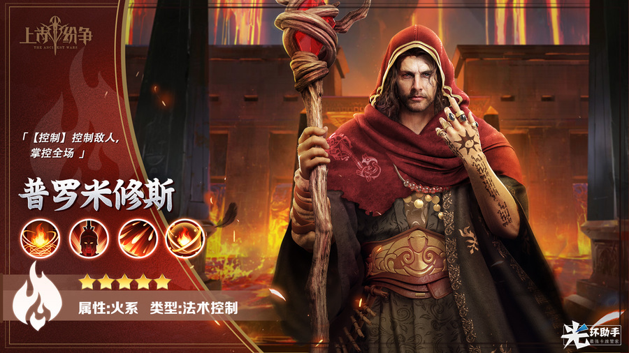 火之国国父,旧日神族,曾协助宙斯平定了奥林匹斯,深受宙斯赏识。然而相处时间久了,普罗米修斯不满于宙斯对普通人类的蔑视,因此带着生命之火来到了上古大陆的东北角。那个时候的火源山脉熔岩四溅,烈火滔天,几乎没有生物能在这里生存。但是当普罗米修斯将生命之火投到火源山脉中时,噬人的热浪立刻变得温暖柔和,火之国随之发展壮大。