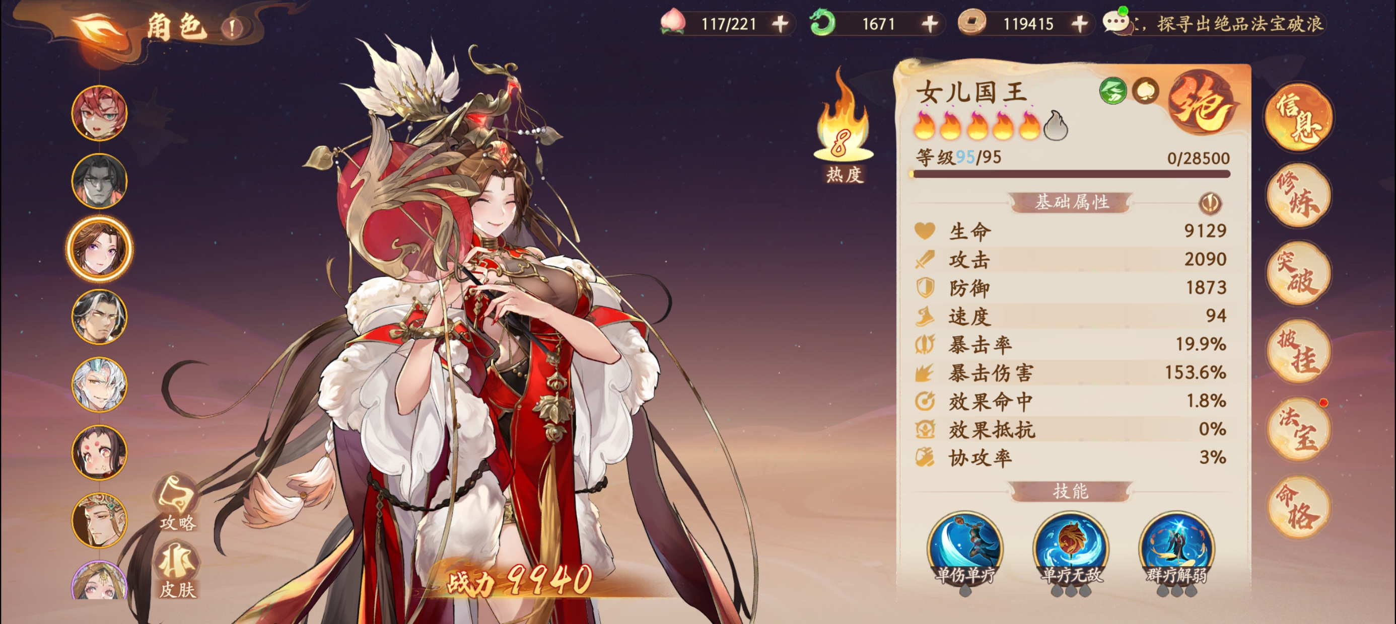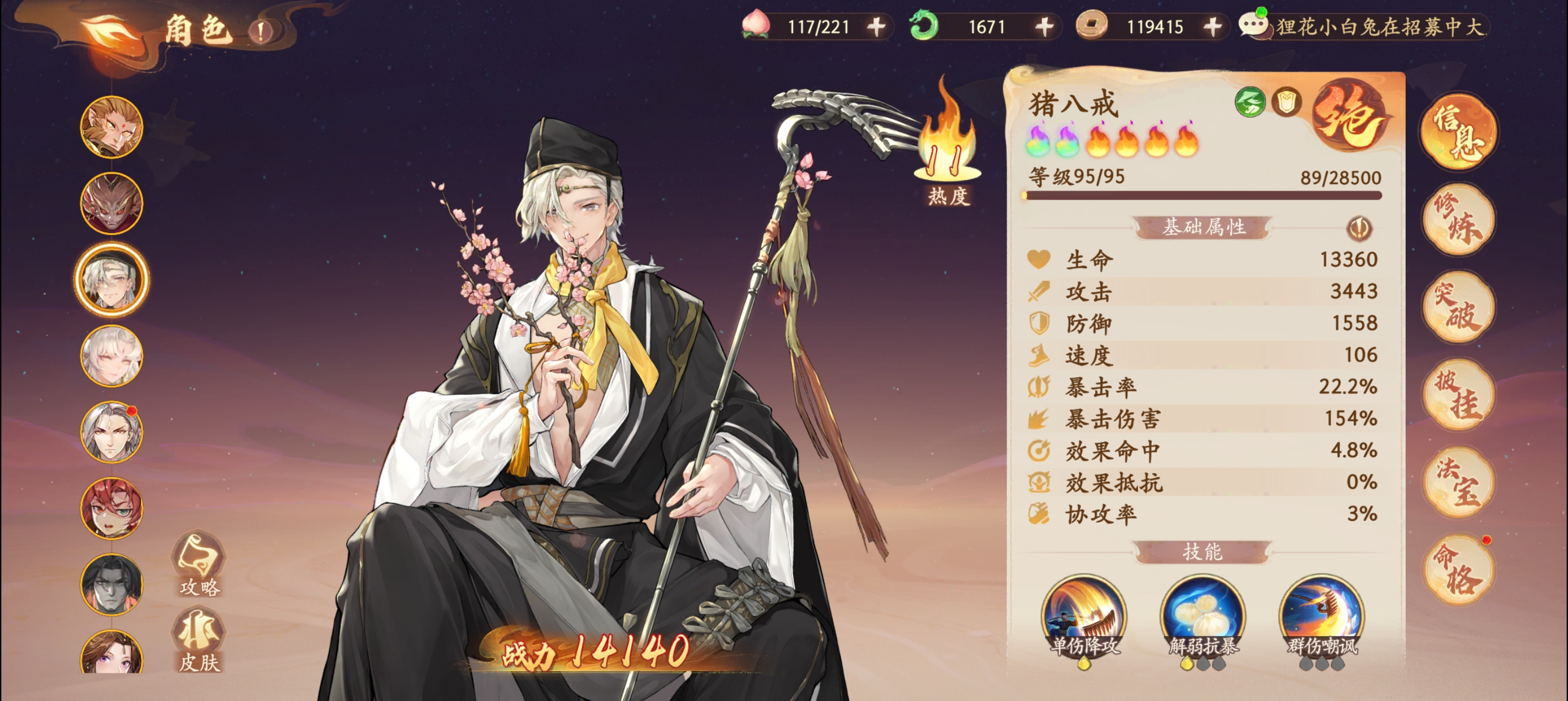同时猪八戒有一定的降低攻击和嘲讽的负面效果,佩戴命中套装可以提升敌人被猪八戒负面命中的几率。