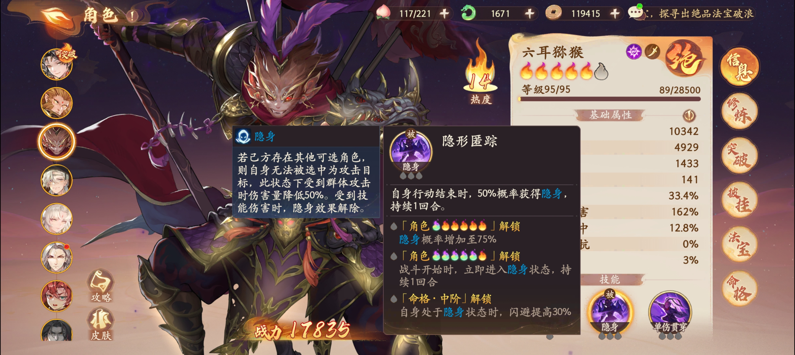 ②【六耳猕猴】技能特性是隐身和速度。
