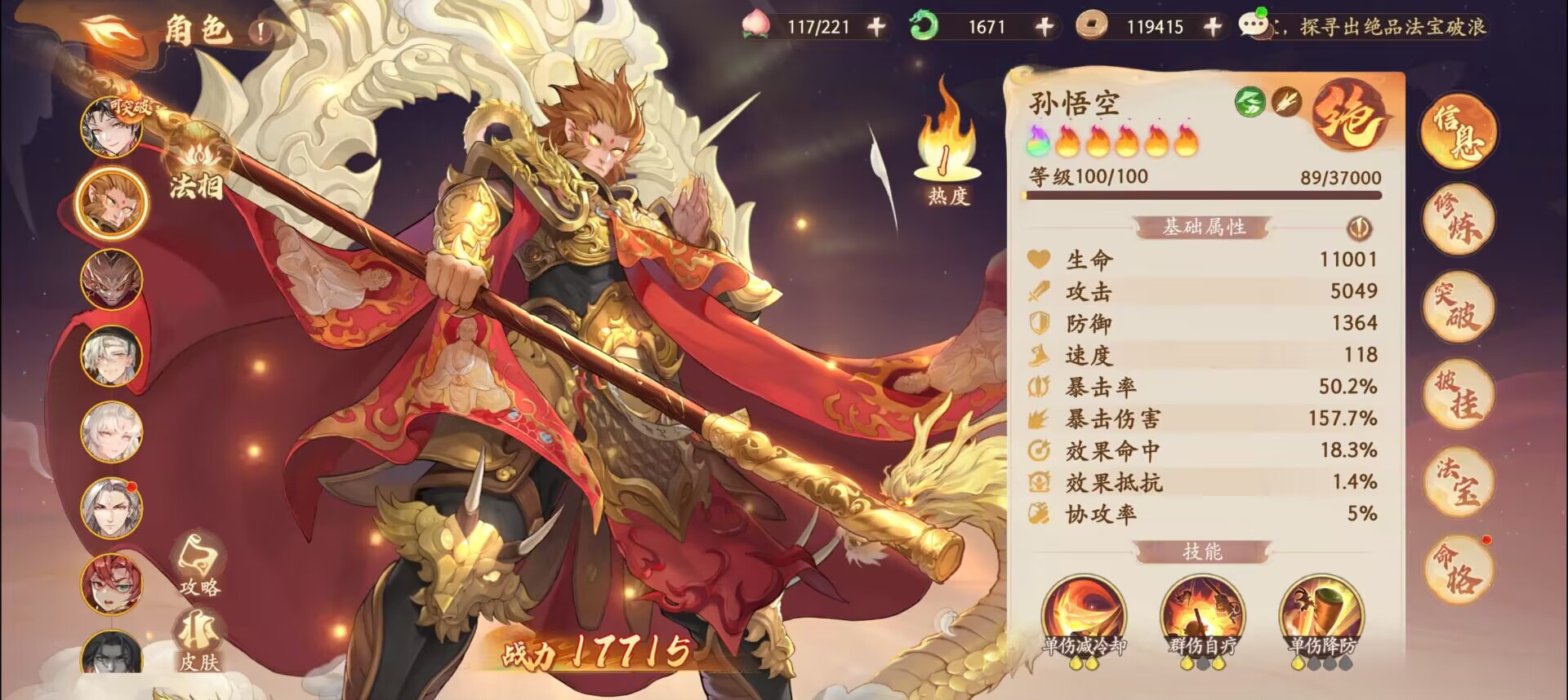 解析:孙悟空的技能特性是暴击,高暴击率可以带来更高几率的暴击伤害同时可以触发技能效果减少技能冷却时间,从而更有效的输出。