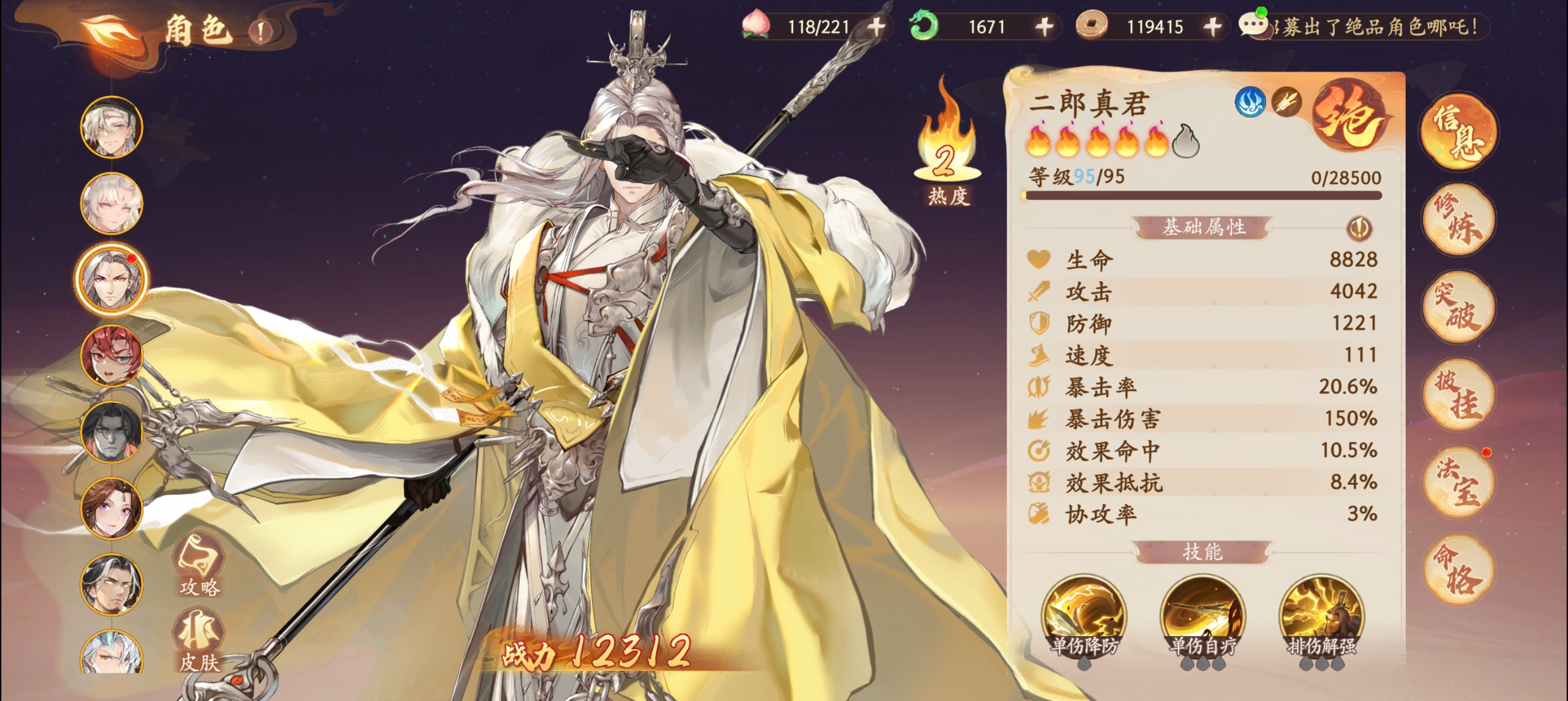 解析:天界战神二郎真君,拥有超高的输出效果,2技能特性自带百分百暴击,所以可以优选选择暴伤套装提高输出。同时自身有攻击提高的buff增益搭配攻击套装也是不错的选择。