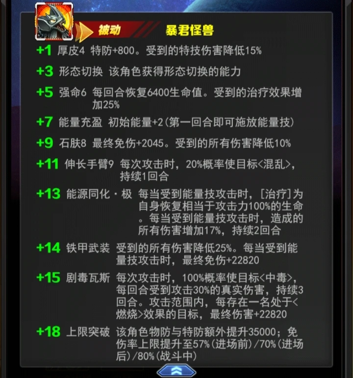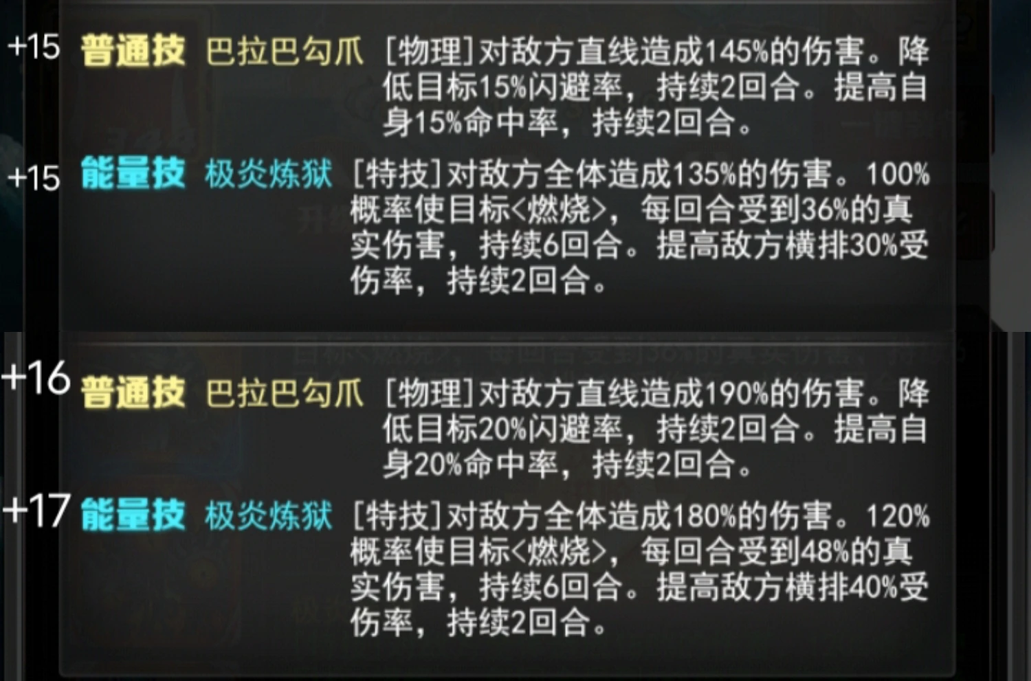 +17能量技 极炎炼狱[特技]对敌方全体造成180%的伤害。120%概率使目标<燃烧>,每回合受到48%的真