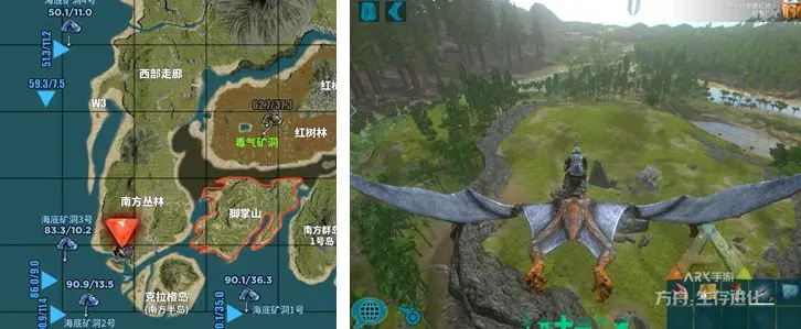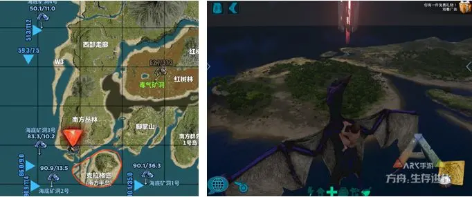 该区域凶险指数比红方舟片区要高,但相对全地图而言,也是属于较安全的。由南方群岛(5座岛屿)、月牙岛(素食岛)、以及2个陆地矿洞(熔岩矿洞、石头林矿洞)和2个海底矿洞组成。陆地出没的野生动物品种繁多,除了素食龙,还会刷很多工具龙譬如甲龙、星尾兽,当然也会出现各种肉食恐龙。陆地上各小土丘会有少量的金属矿,水晶和黑曜石较少。