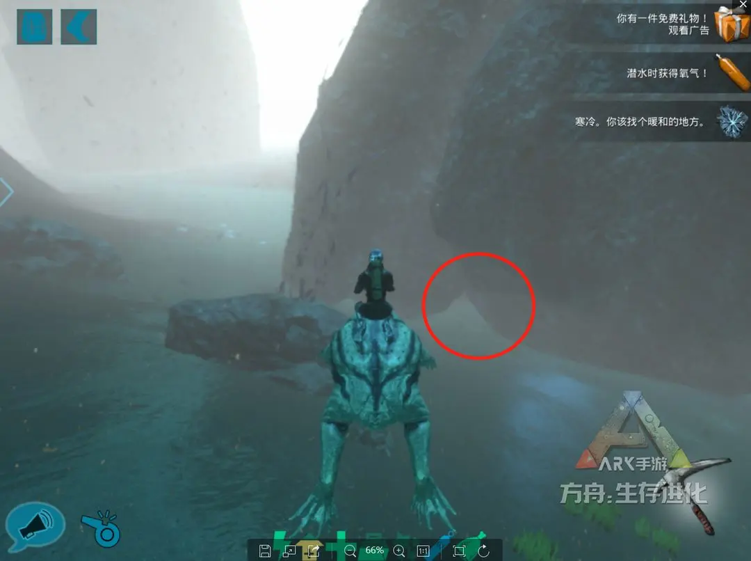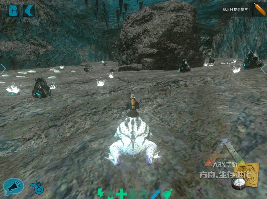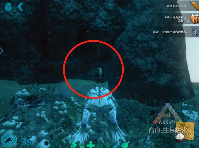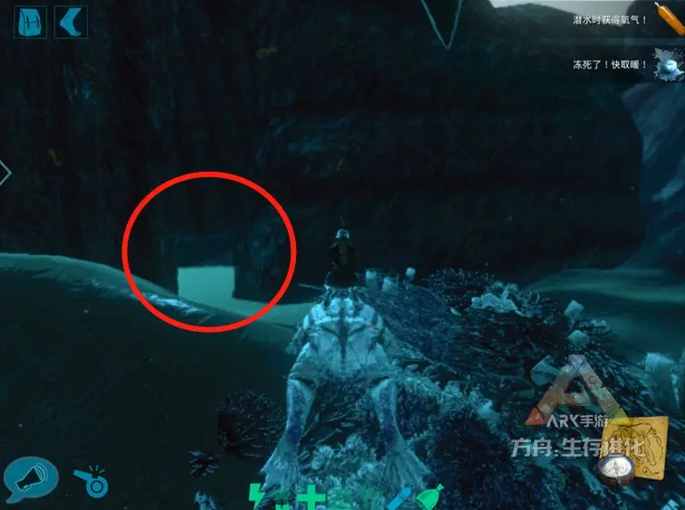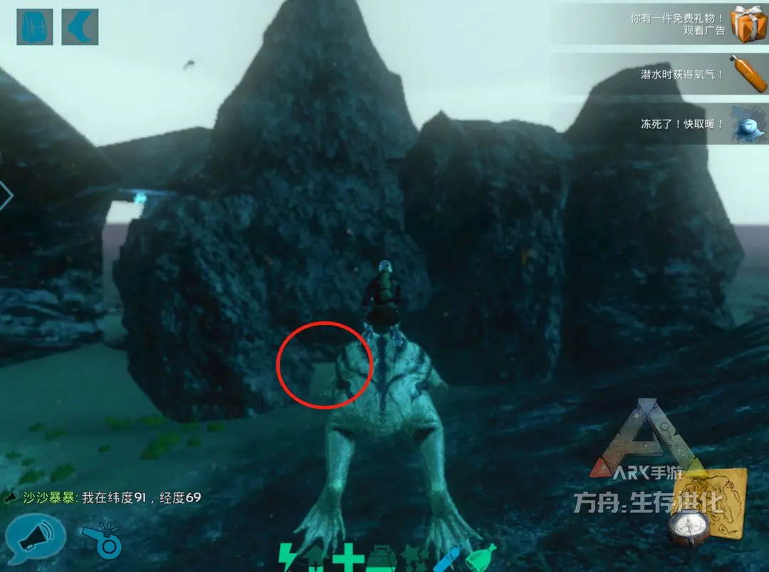 海底矿洞3号地处“红方舟”正西侧海域,与1号和2号一样,找的时候,打开地图找Y83,下去找X10左右的海底岩石。小编探点的时候,这里的蛇颈龙蛮多。同理,入口处有少量牡蛎与石油矿,入口如图所示。矿洞内有牡蛎、石油、水晶。同理,此矿洞附近也有一处海底补给站(Y 86 /X 9)。