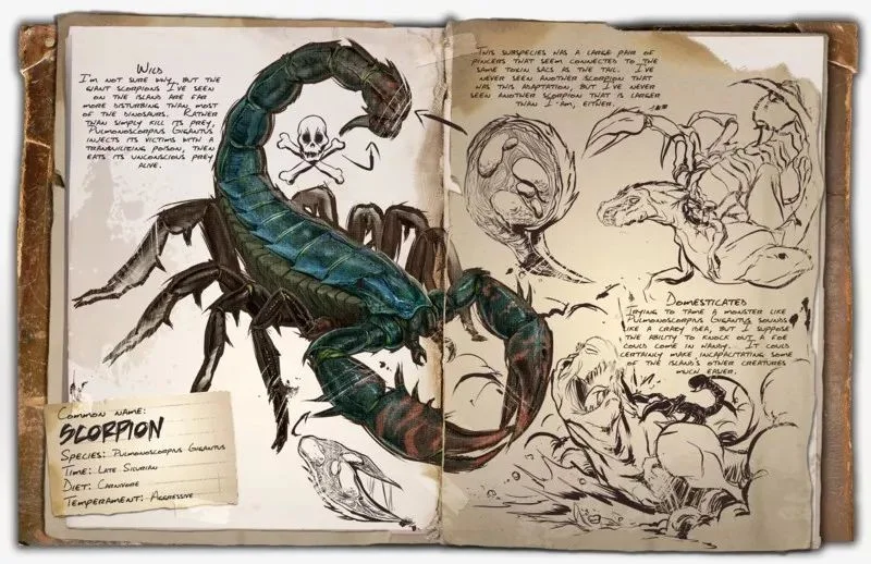 7、巨蝎:有了一定资源后,先去驯几只蝎子,蝎子用腐肉驯,而且非常好训,驯一只雄的多只母的,蝎子饲料驯霸王龙、巨蛙必备。除了蝎子蛋做饲料外,巨蝎的毒也可以用来驯养巨型恐龙,但总的来说还是麻醉枪最实用了。蝎子一般在一些矿洞和地穴里都可以找到。一个人可不要去哦,有点危险。