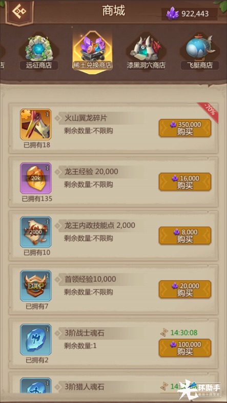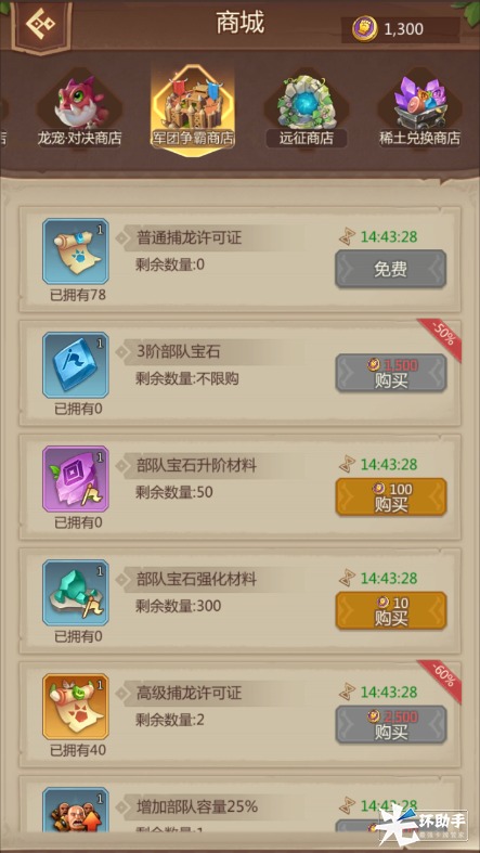 军团争霸商店:在角斗场中首领军团争霸挑战其他玩家和每日排名奖励来获取兑换货币,可以兑换部队宝石以及部队宝石的升星强化材料、高级捕龙许可证、增加部队容量25%buff。主要兑换部队宝石和其材料。