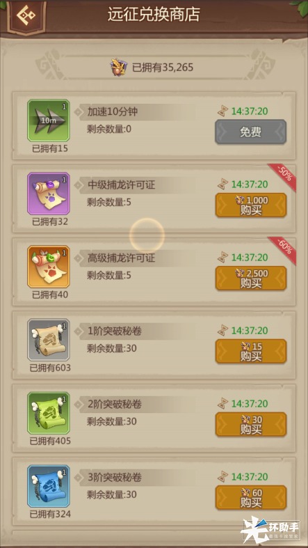远征商店:在远征副本中挑战关卡,通过关卡以及每日奖励获取兑换货币。可以兑换中级、高级捕龙许可证、1~5突破卷、强化材料。主要兑换强化材料。