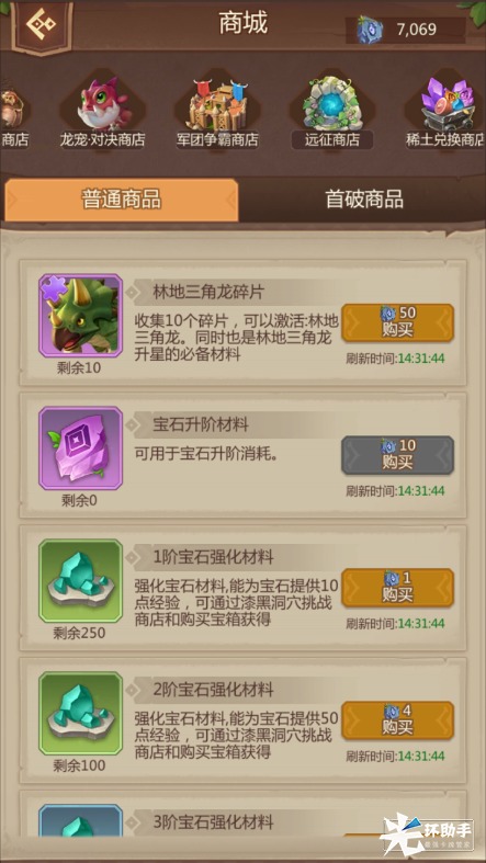 漆黑洞穴商店:在漆黑洞穴副本中挑战关卡,通过关卡以及每日奖励获取兑换货币。其中兑换商品里的奖励可以等待各类的活动领取相对应的奖励。普通商店可以兑换林地三角龙的碎片以及宝石的各种升星强化材料各类的加速。主要兑换首破商品的奖励以及宝石的材料和加速训练。
