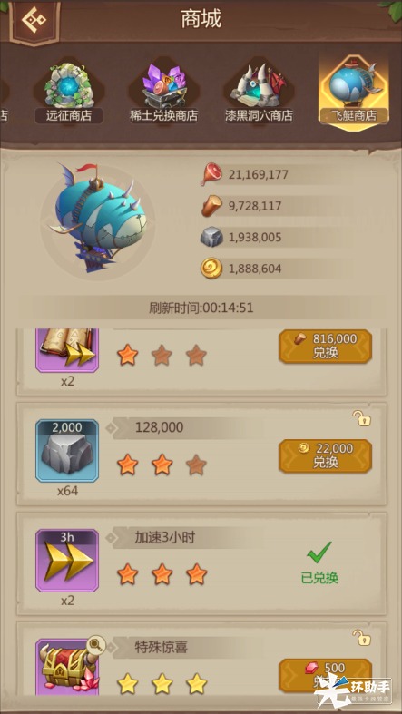 飞艇商店:通过时间冷却刷新出新的商店,需要通过资源来兑换奖励,兑换后可能会出现特殊惊喜,需要充值或者水晶购买。其中有各类加速以及资源。