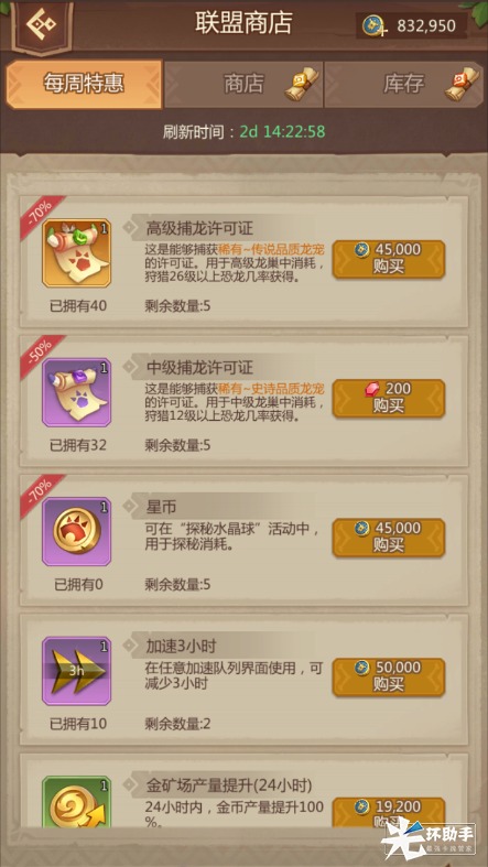 军团对决商店:在角斗场中军团对决挑战其他玩家和每日排名奖励来获取兑换货币,可以兑换异齿龙、剑龙、异特龙碎片、以及各类加速。主要兑换异特龙碎片以及自己所需的加速。