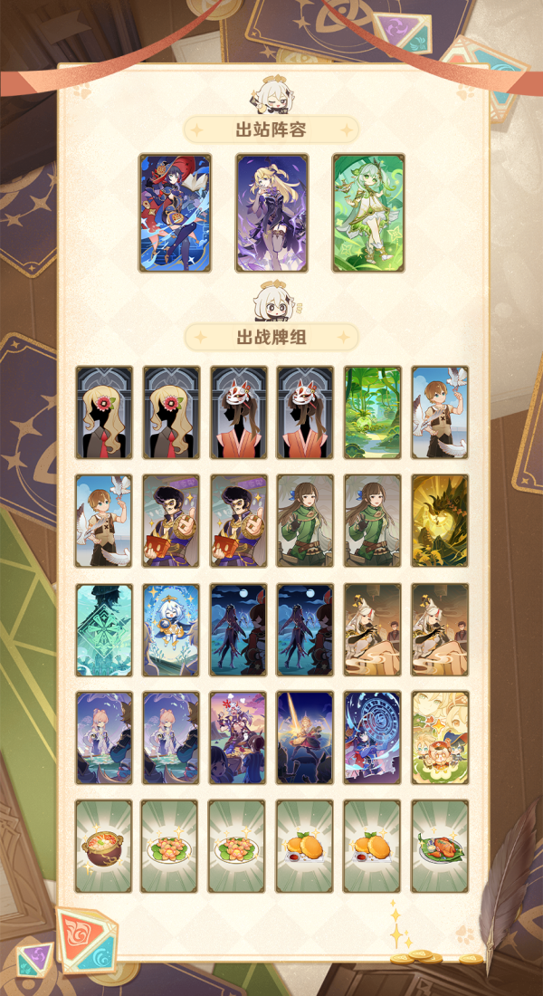 原神·七圣召唤丨三色速攻莫皇草,快速获胜的好选择原神 - 新闻星发布于 2023-09-20关注 旅行者们大家好,这里是墨菊,今天带来的是围绕激化/绽放/感电反应的速攻卡组——莫皇草,在目前大部分卡组里,是节奏偏快的卡组,能够利用感电以及蕴种印对对方前台造成大量伤害的同时,削减对方后台角色的血量。PS:帖子底部附上卡组构筑。 「赌徒的耳环」:速攻卡组常用圣遗物,在本卡组中由能够击杀对方角色的角色在行动时佩戴,没有固定的佩戴角色。「无常之面」:本卡组中角色通常只施放战技来进行输出,比起其他只针对某个元素类型的圣遗物,在本三色卡组里会更通用一些,缺点是无法减少施放元素爆发时所需要的骰子。「桓那兰那」:通常在其他手牌无法消耗剩余骰子时打出存取费用,但本卡组中也有立本存在,因此需要注意一下打出顺序,防止立本无法在次回合开始时触发。「拉娜」:2费骰子投资类型的伙伴牌,本卡组的角色通常不会连续行动,因此拉娜能够较好的保证角色整体的输出节奏,也能够减少一些骰子投掷的压力。「立本」:七圣召唤登场至今地位都较高的蓄爆牌,在骰子较差时打出用以下回合的爆发,或对方进行存费蓄爆时打出用来应对对方下回合的爆发。「乾坤一掷」:存下桓那兰那的无效骰子后,能利用该卡来在次回合转化为有效骰子,是三色卡组常带的骰子牌。「提米」:速攻卡组常带的伙伴牌,带第一回合打出能为第三回合进行蓄爆。「风与自由」:双蒙德共鸣卡牌,也是速攻卡组常带的卡牌,通常不会连续使用两次,在残局时搭配赌徒的耳环有比较不错的收尾能力,如果怕抓不到该牌,也可以考虑带两张。「星天之兆」:用来为一些三充能的角色补充最后一点充能使用,能够打出出其不意得到效果。食物牌:仙跳墙/唐杜尔烤鸡是提高斩杀线的食物,其他食物主要用来提防对方更快速的进攻。 作者:原神西风驿站