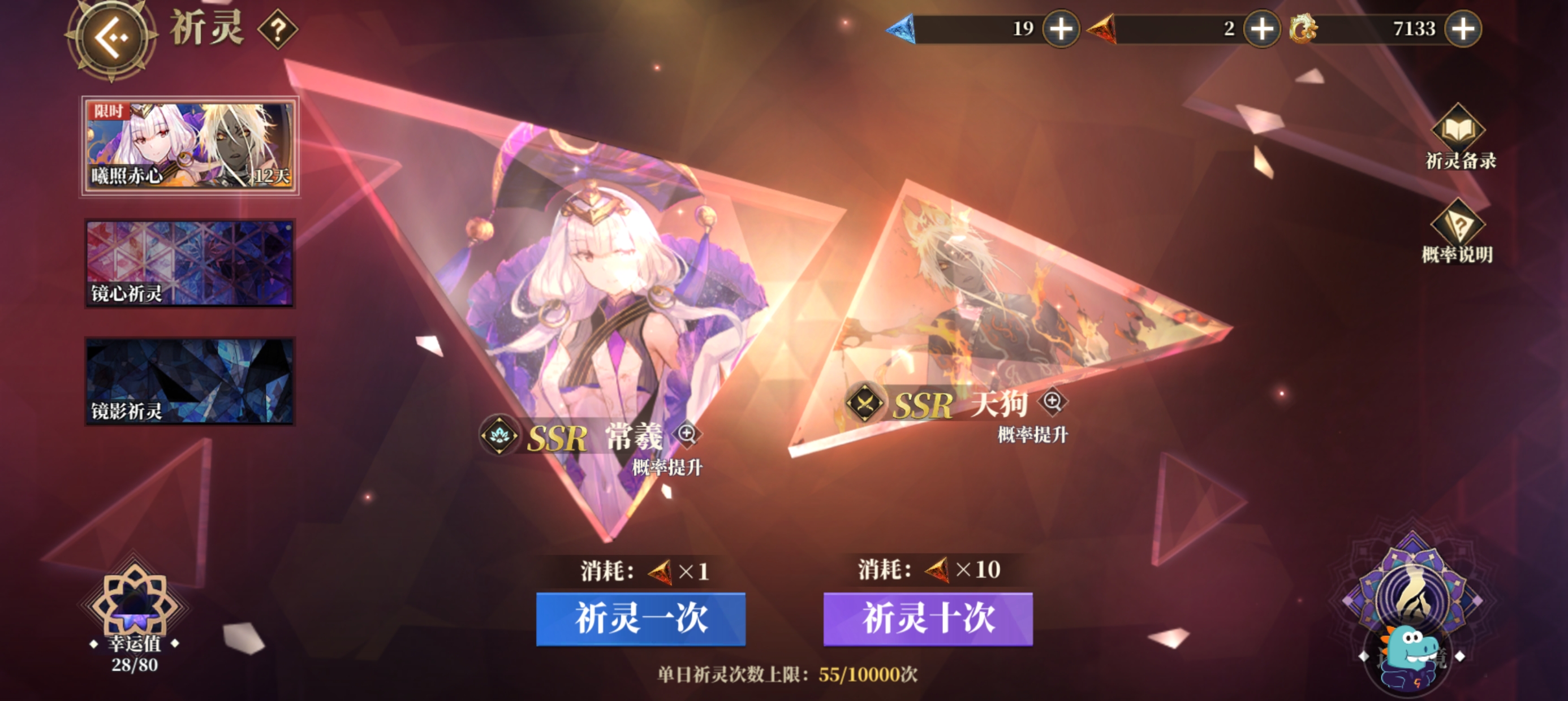 (ps:这里重点说一下关于限定镜灵,前期不用抽太多天狗和常羲,存点抽卡给后续的限定镜灵用,因为7天以后才出新手村)。