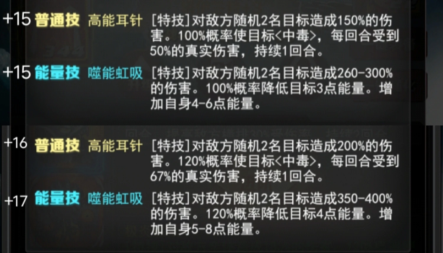 +17 能量技 噬能虹吸 [特技]对敌方随机2名目标造成350-400%的伤害。120%概率降低目标4点能量。增