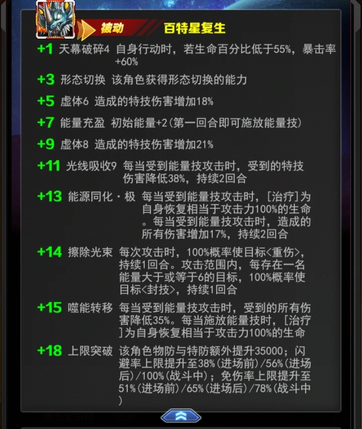 +15能量技 噬能虹吸[特技]对敌方随机2名目标造成260-300%的伤害。100%概率降低目标3点能量。增