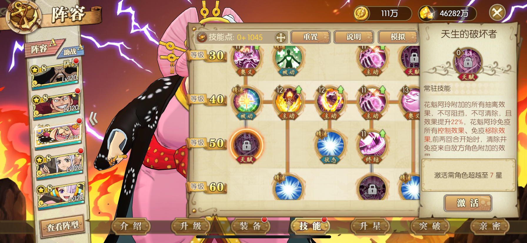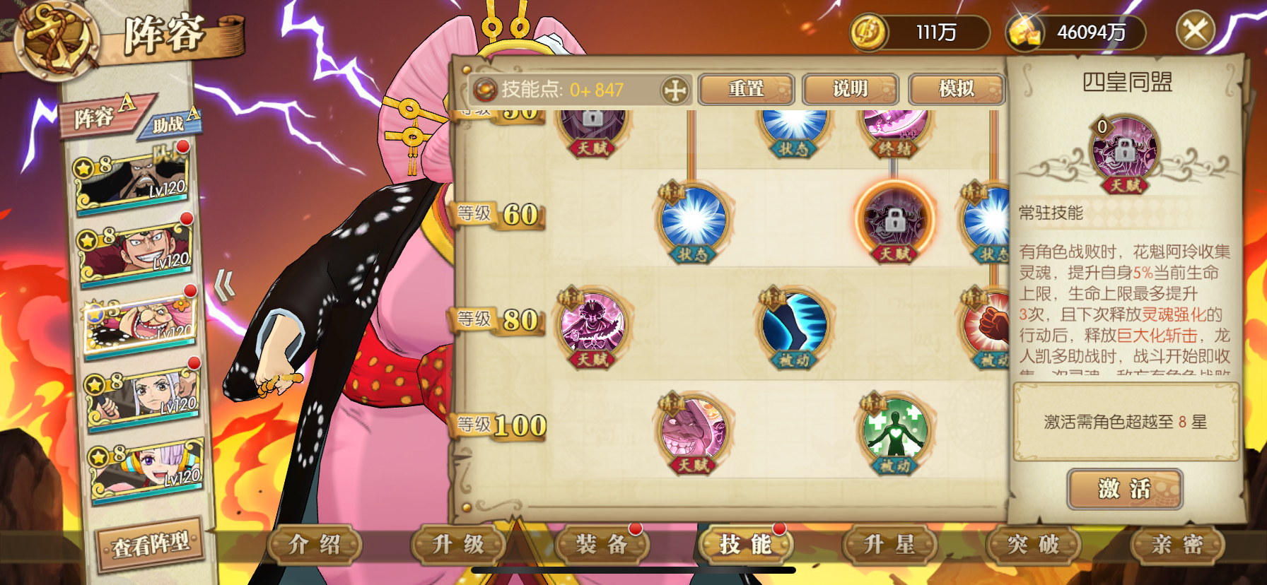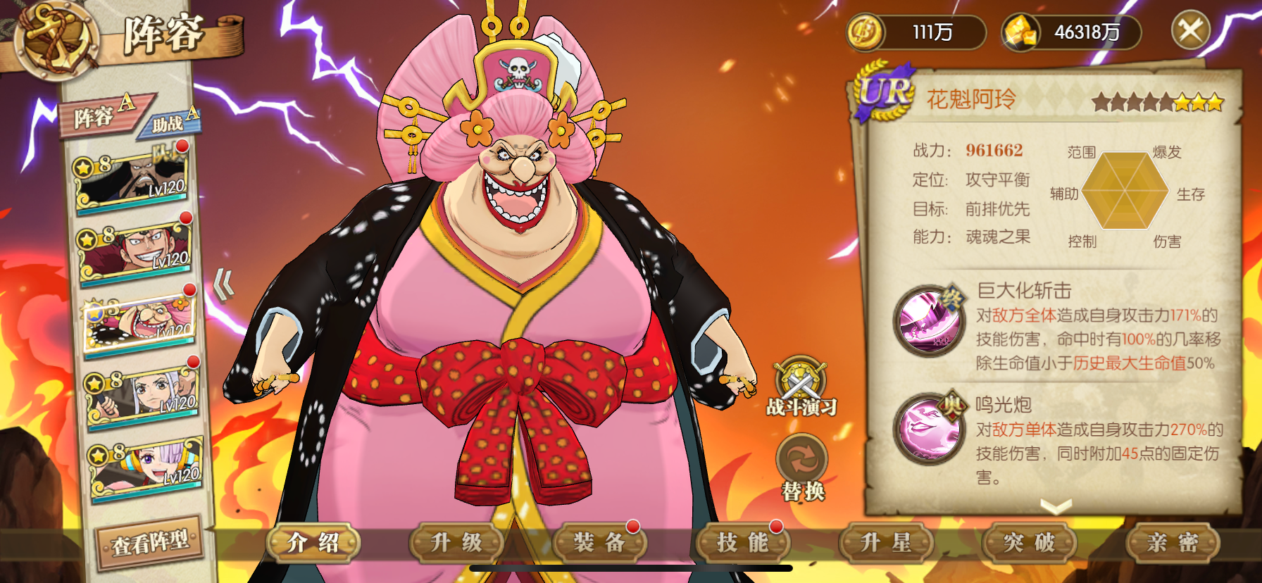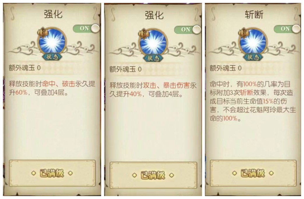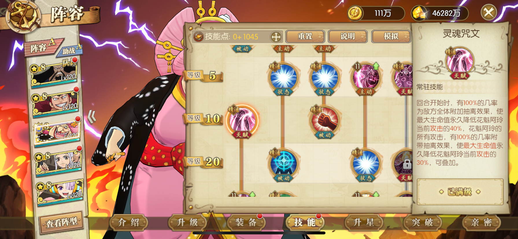 有角色战败时,花魁阿玲收集灵魂,提升自己15%的当前生命上限,生命上限最多提升3次数,且下次释放灵魂强化的行动后,释放巨大化斩击,龙人凯多助战时,战斗开始即收集一次灵魂。敌方有角色战败时,花魁阿玲对敌方生命最高的角色施加抽离效果,使目标最大生命值永久降低花魁阿玲当前攻击300%,可叠加。