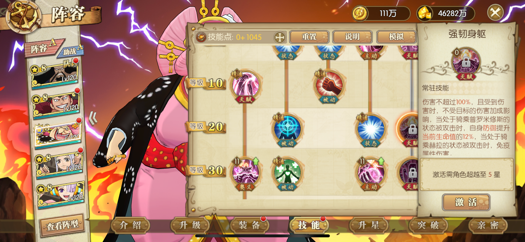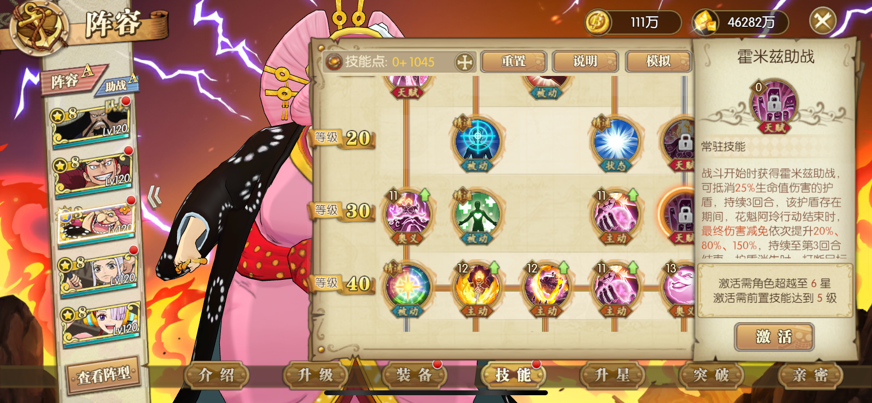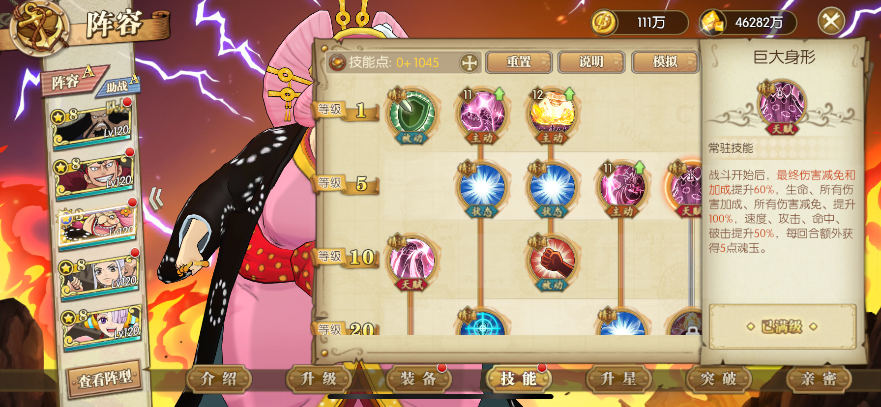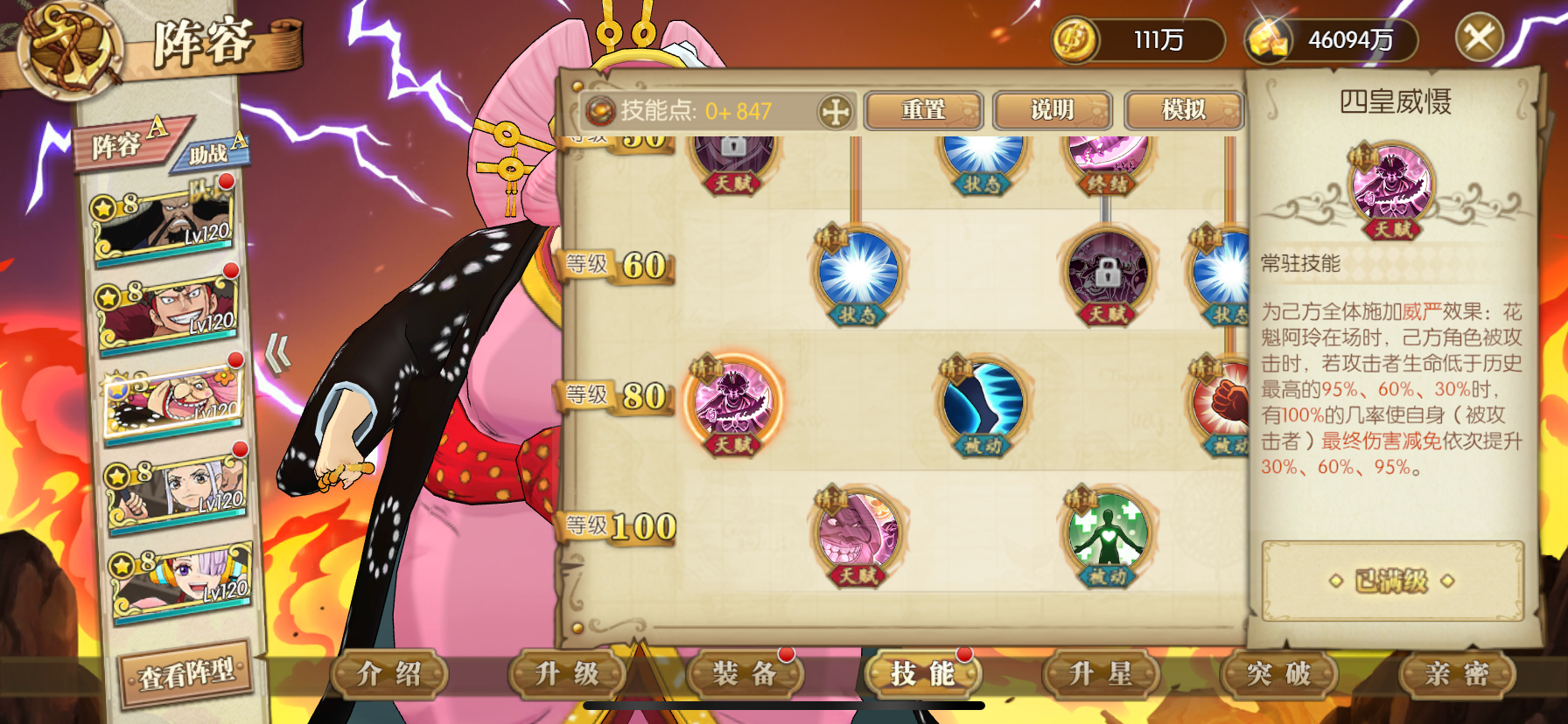 有角色战败时,花魁阿玲收集灵魂,提升自己15%的当前生命上限,生命上限最多提升3次数,且下次释放灵魂强化的行动后,释放巨大化斩击,龙人凯多助战时,战斗开始即收集一次灵魂。敌方有角色战败时,花魁阿玲对敌方生命最高的角色施加抽离效果,使目标最大生命值永久降低花魁阿玲当前攻击300%,可叠加。