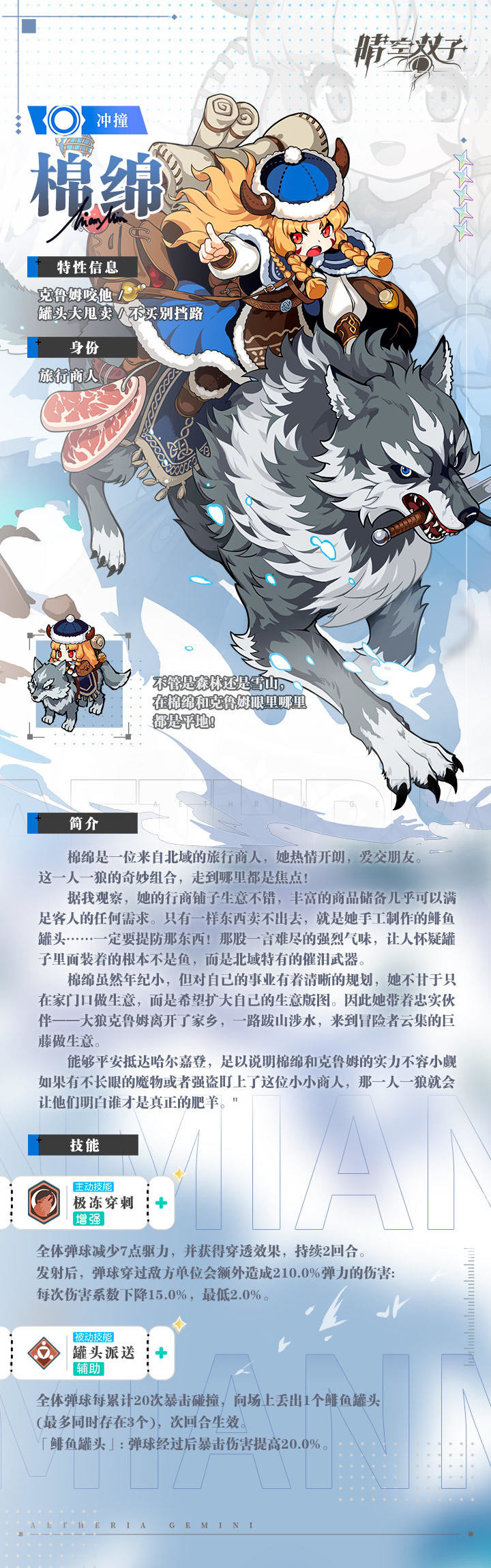 棉绵是一位来自北域的旅行商人,她热情开朗,爱交朋友。这一人一狼的奇妙组合,走到哪里都是焦点!