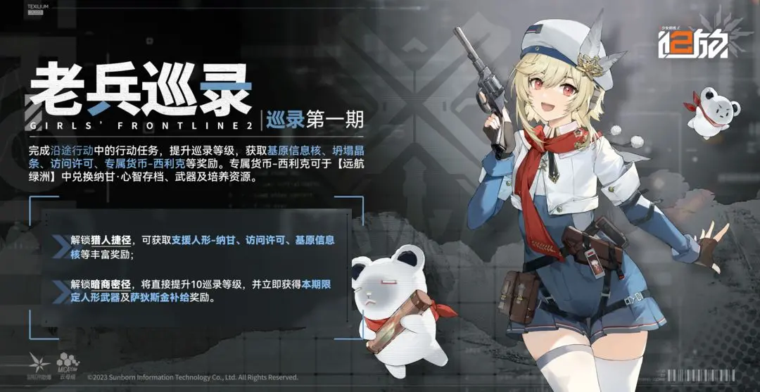 开启航线解锁,解锁【猎人捷径】,可获取支援人形-纳甘、访问许可、基原信息核等丰富奖励;解锁【暗商密径】,将直接提升10巡录等级,并立即获得本期限定人形武器及萨狄斯金补给奖励。