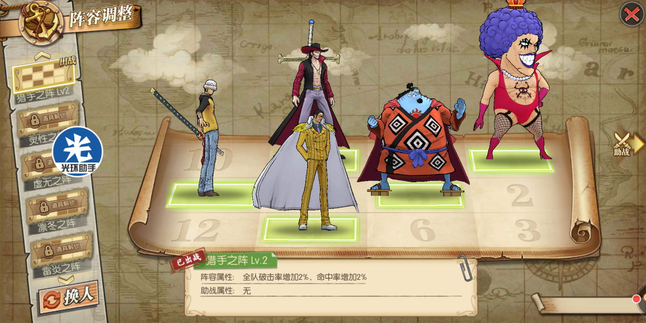 最后说一下阵容跟列阵,阵型我推荐猎手阵,蓝色猎手阵,两个助战位置,平民首选,