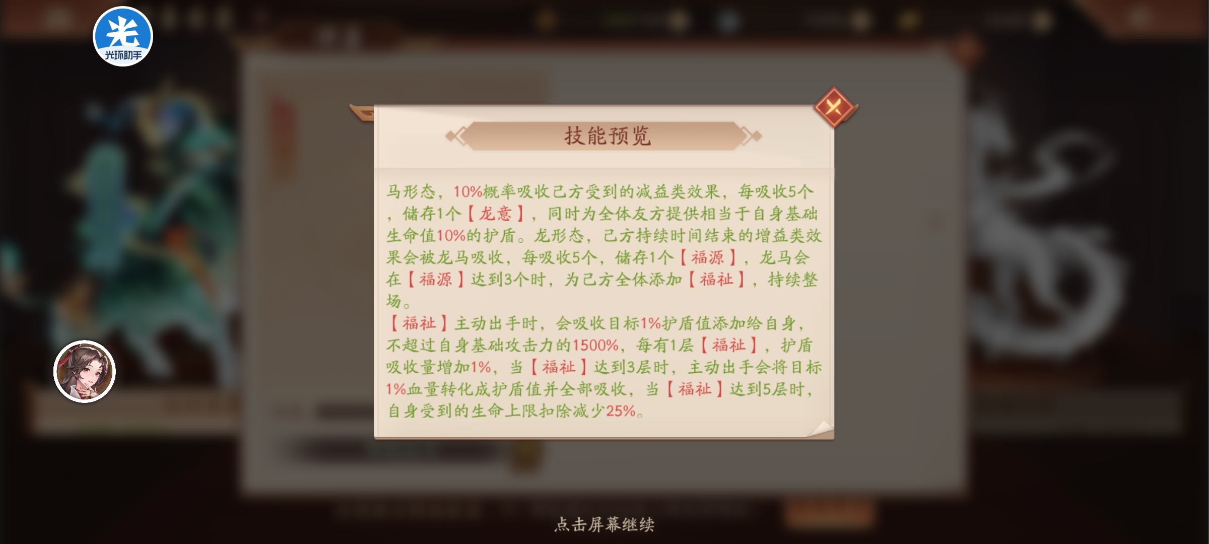 马形态,10%概率吸收我方受到的减益类效果,每吸收5个,储存1个龙意,同时为全体友方提供相当于自身基础生命值10%的护盾。
