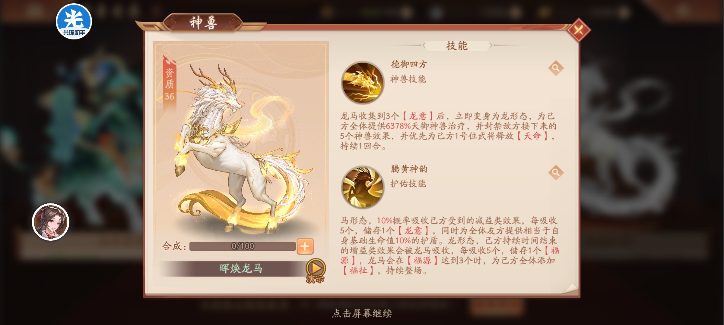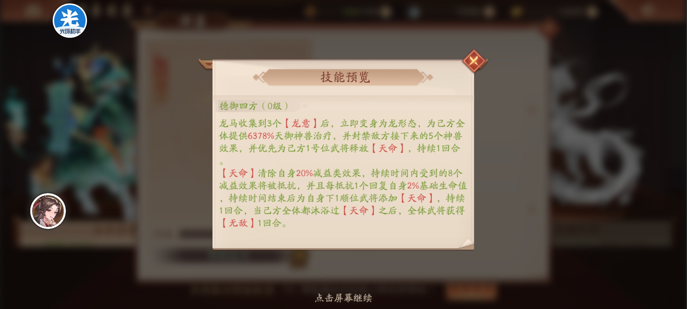 龙马收集3个龙意后,立即变身龙形态,为我方全体提供6378%天御神兽治疗,封禁敌接下来5个神兽效果,并优先为我方1号位武将释放天命持续1回合。