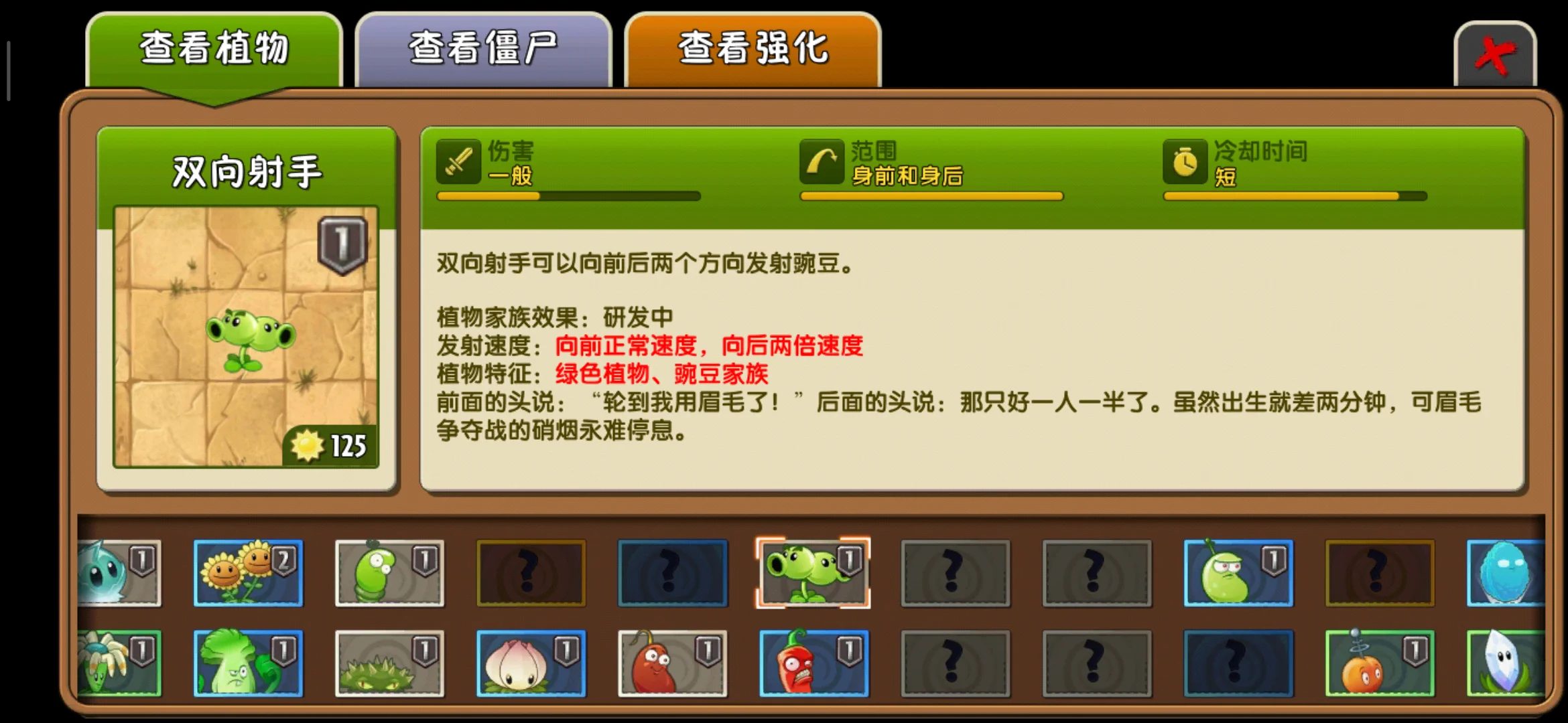 狂野西部世界中添加了新的主线植物——双向射手,巴豆还有闪电芦苇。像双向射手和闪电芦苇这两种植物会一直活跃在狂野西部世界中的,这取决于狂野西部世界的特殊性。狂野西部世界中增添了导轨场景,我们可以将植物种植在导轨在小车上,可以通过拖动小车控制植物所在的位置,这样玩家就可以更加快速的支援防御弱的那一排。而在僵尸中,也有一种僵尸会从僵尸的出发点直接跳到我们的屋子门前,不过万幸的是这种僵尸只能倒走前走,而这个时候就体现出了,双向射手的重要性,我们可以攻击后方来的僵尸。