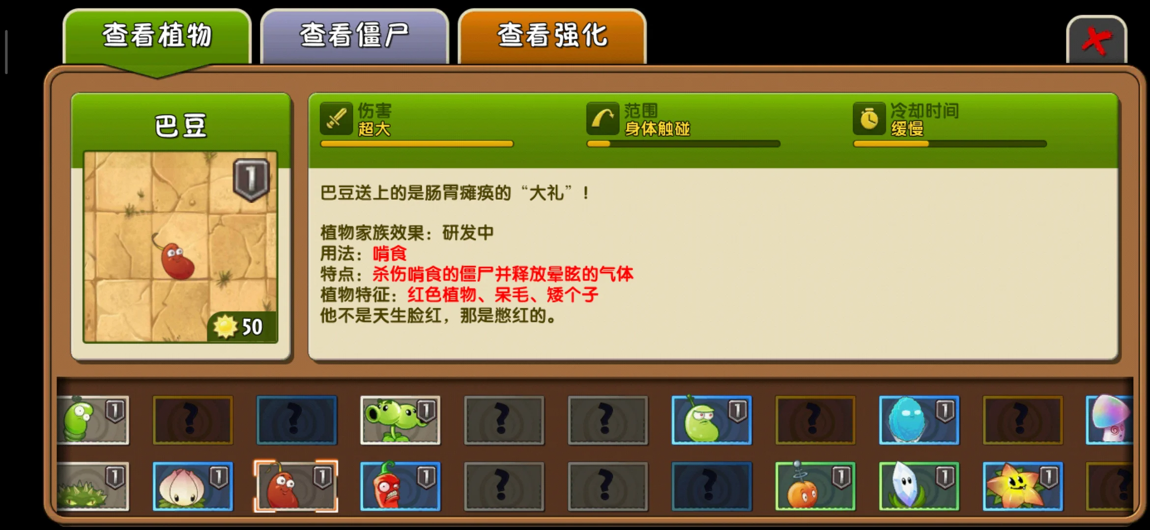 巴豆就比较有意思了,它也属于一次性植物,吃过巴豆的僵尸会直接中毒,中毒之后不光会死去,而且还会向后方放出一股臭屁,将后边的晕眩住,效果确实挺有意思哈,在对抗僵尸中能够起到意想不到的作用呢!
