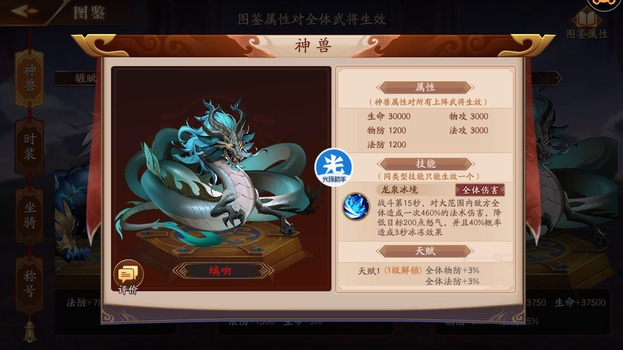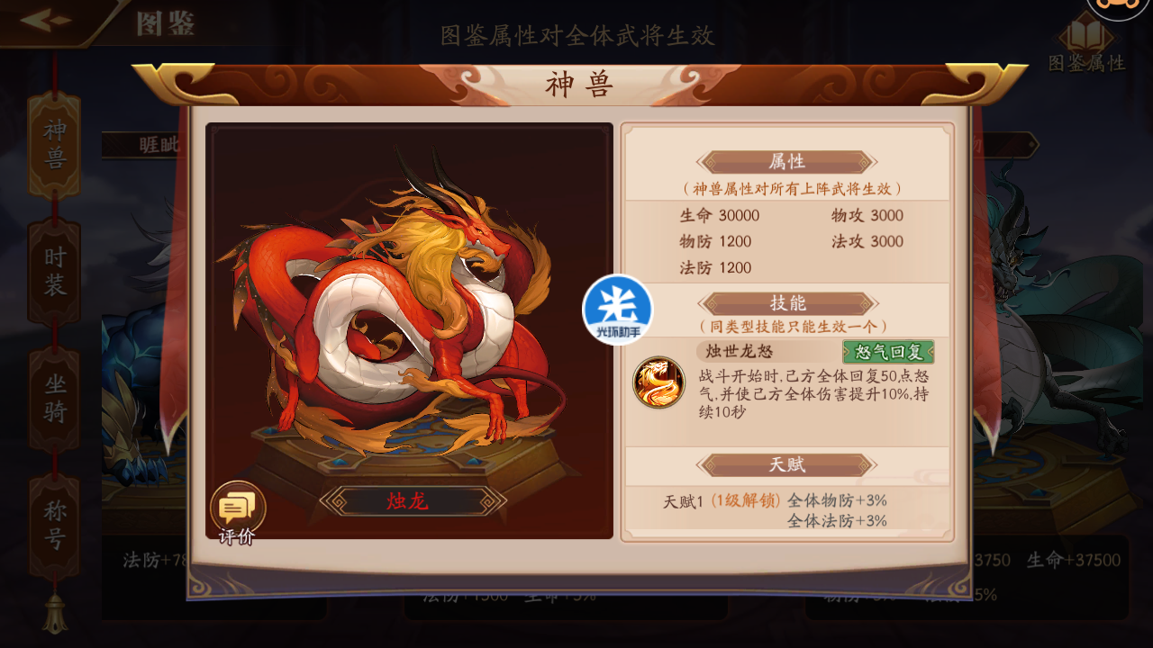 2、神兽攻击力的基础属性为神兽自身的属性,而不是武将的属性。反过来,神兽的属性却可以加到全体武将身上。