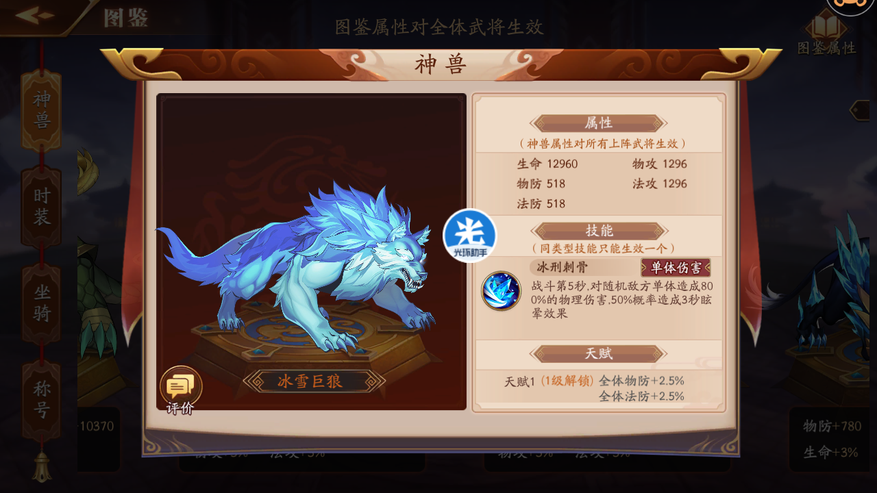 3、冰雪巨狼,蜀国因为有赵云在,很容易造成对方减员,这时候再用群攻技能的神兽有点不划算,单体伤害的冰狼是一个不错的选择,伤害高,还带眩晕控制。