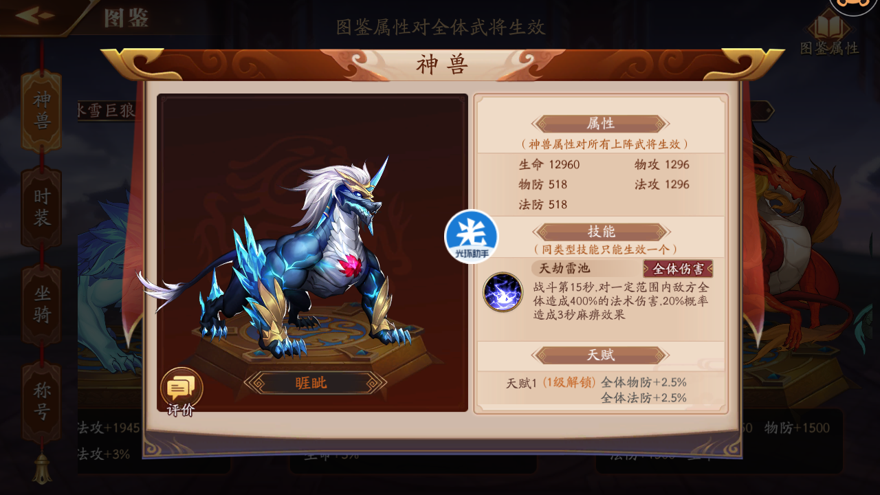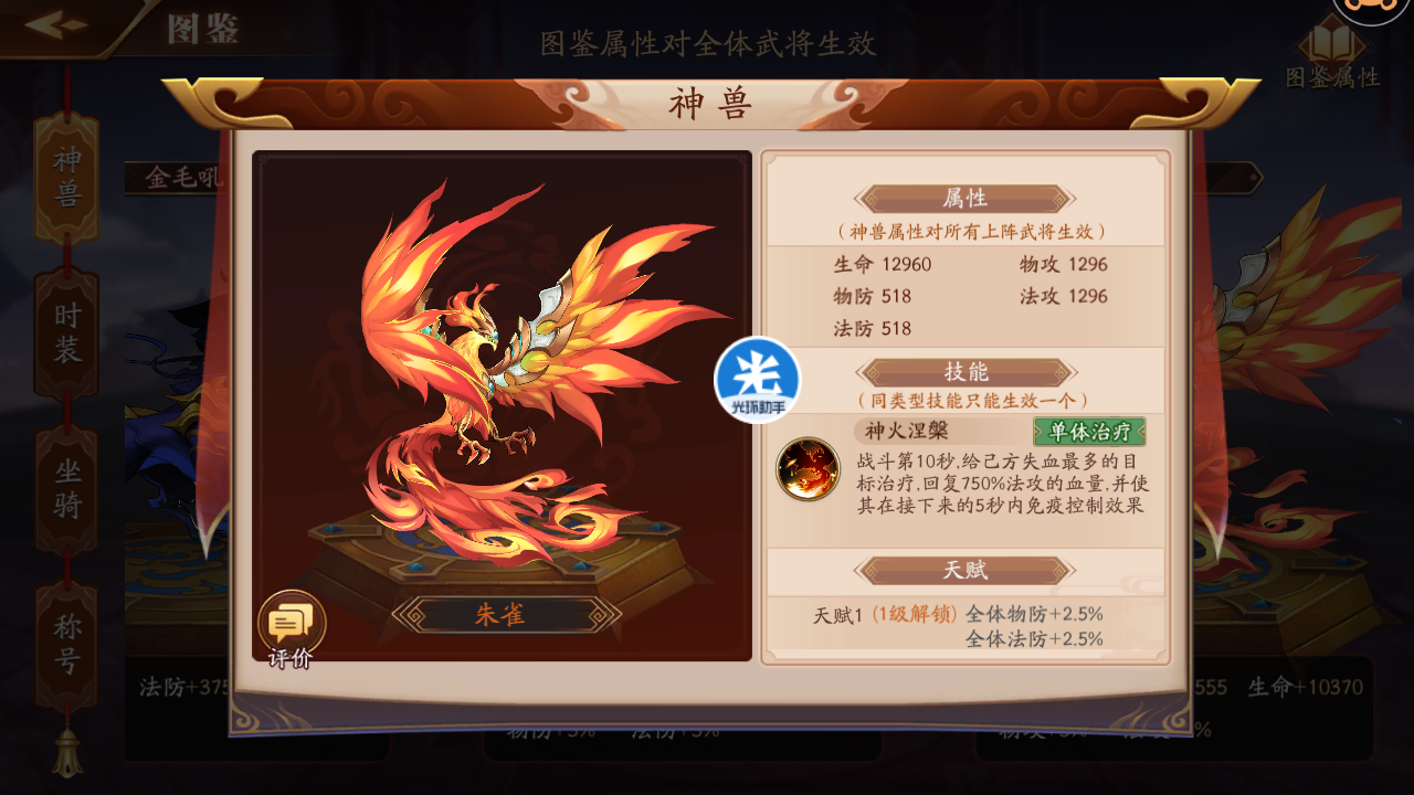 3、尽量使用等级高的神兽。等级高,不仅增加的属性比较多,而且会触发等级天赋,得到全体物攻%、全体法攻%等比较好的属性。
