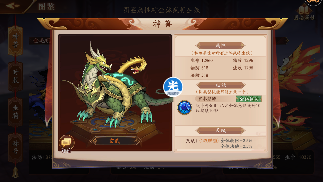3、玄武,前10秒免伤10%。目前唯一的免伤神兽,等后续新的高级免伤神兽,可以替换。