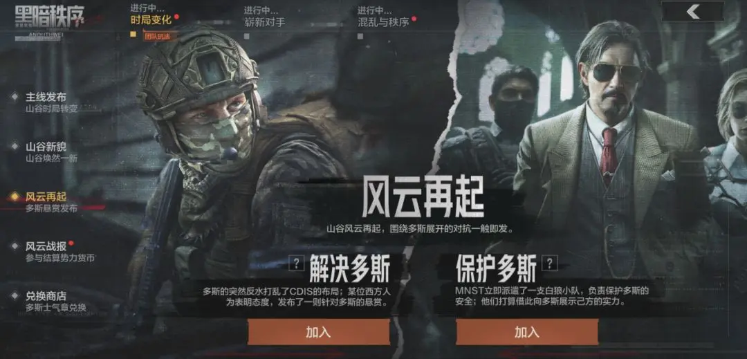 在新版本中,我们准备了全新势力玩法“风云再起”,将剧情重要人物多斯的生命安全托付给各位先锋。剧情里,多斯在农场交易后转投MNST(特维拉),CDIS(科伦)随即发布追击任务,兰德尔与托马斯已雇佣人手到山谷剿灭多斯势力,而MNST得知消息后,立刻作出回应,招募了一队专业小队来保护多斯。