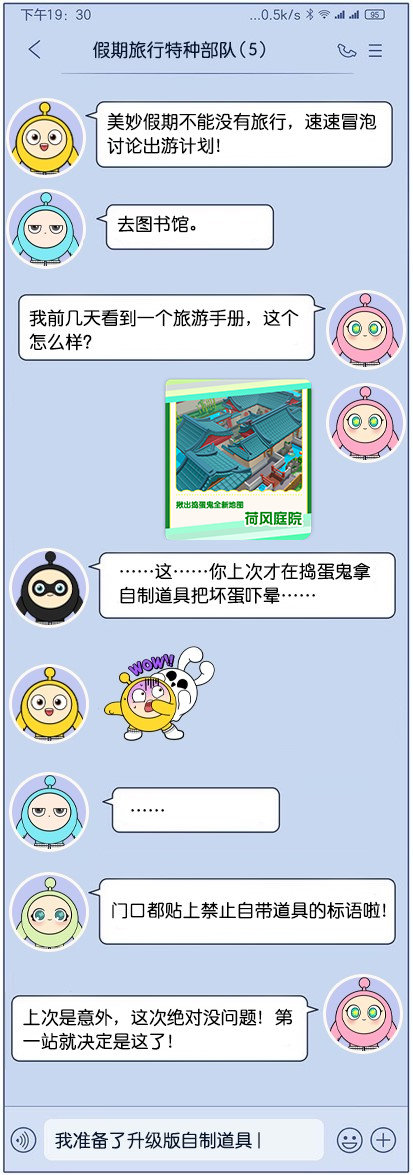 四小只(划掉)五小只这场说走就走的旅行即将拉开序幕奶茶喝饱嗝发布于 2023-09-23关注长达8天的金秋假期即将到来,快乐小天使小黄向一众小蛋仔们发出了旅行邀请。然而蛋仔岛奇趣景点颇多,首站该去往何处?讨论热火朝天之际,小粉甩出一张旅行宣传单,一锤定音![憧憬]快乐小天使的蛋生信条就是说走就走,拉上新朋友立刻飞奔出门外!诶等等,走之前你先让她做个自我介绍啊喂![偷笑]————————————————四小只(划掉)五小只这场说走就走的旅行即将拉开序幕,他们都会解锁哪些旅行趣闻与奇妙体验呢?[馋嘴]敬请期待……