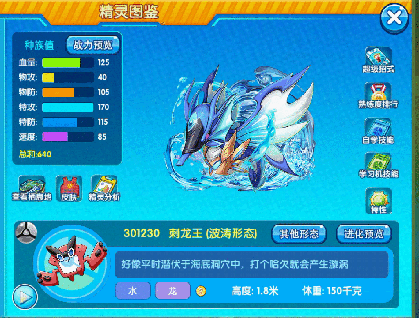 口袋妖怪科普:外型酷似海马,头上有类似中国龙的角,从应该是鳃盖的地方长有一对鳍。刺海马身上的毒刺在进化成为刺龙王之后都没有了。刺龙王栖息在深海的洞穴里。刺龙王的非官方的常用译名是海马龙。刺龙王的造型源于海马和龙王,头鳍和背鳍可能源于海马的拟态。会引起龙卷风和潮旋可能来自于卡律布狄斯。原名鱼龙王😂