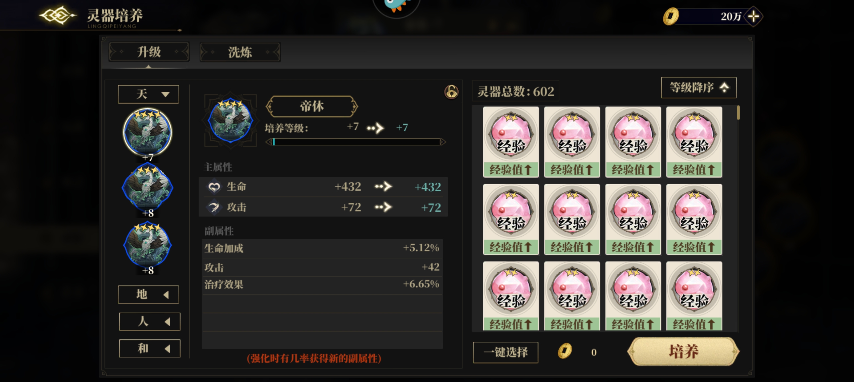 前期不用太在意副属性,造化副本毕业后全身有4星的灵器以后,在去考虑弄灵器的胚子培养。