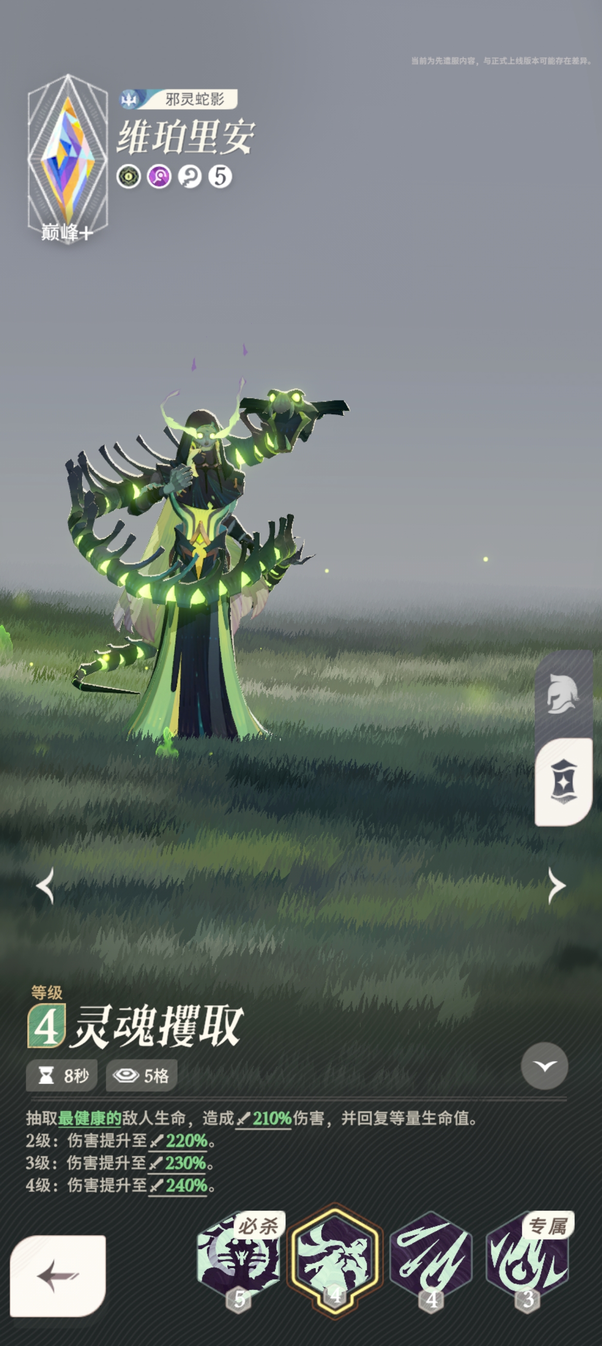 6. 当 5 级技能升级完成后,当被"冥蛇"附身的敌人被击败时,"冥蛇"会返回维珀里安身上,并回复 10% 的最大生命值和 150 点能量。
