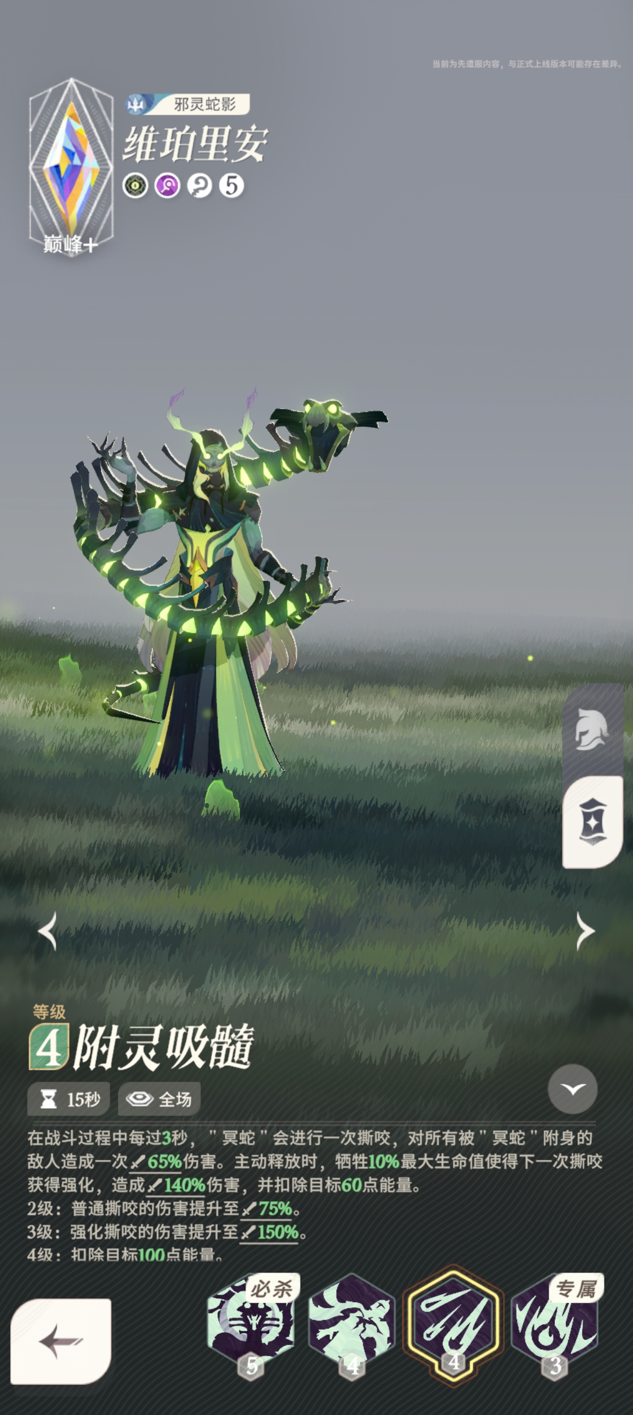 2. 当主动释放附灵吸髓时,需要牺牲 10% 的最大生命值,使得下一次撕咬获得强化,造成攻击力 140% 的伤害,并扣除目标 60 点能量。