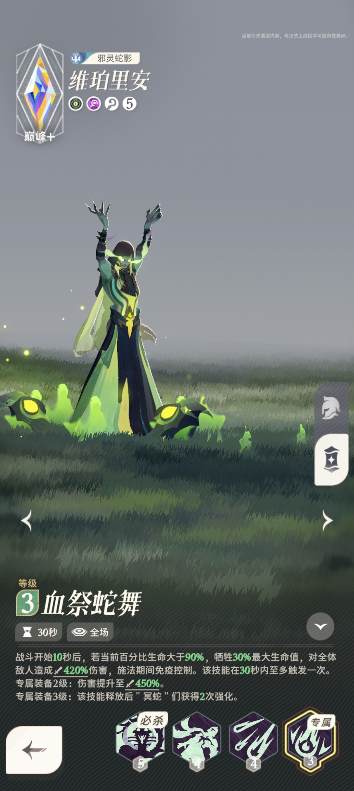 3. 专属装备 2 级时,血祭蛇舞的伤害提升至攻击力 450%。