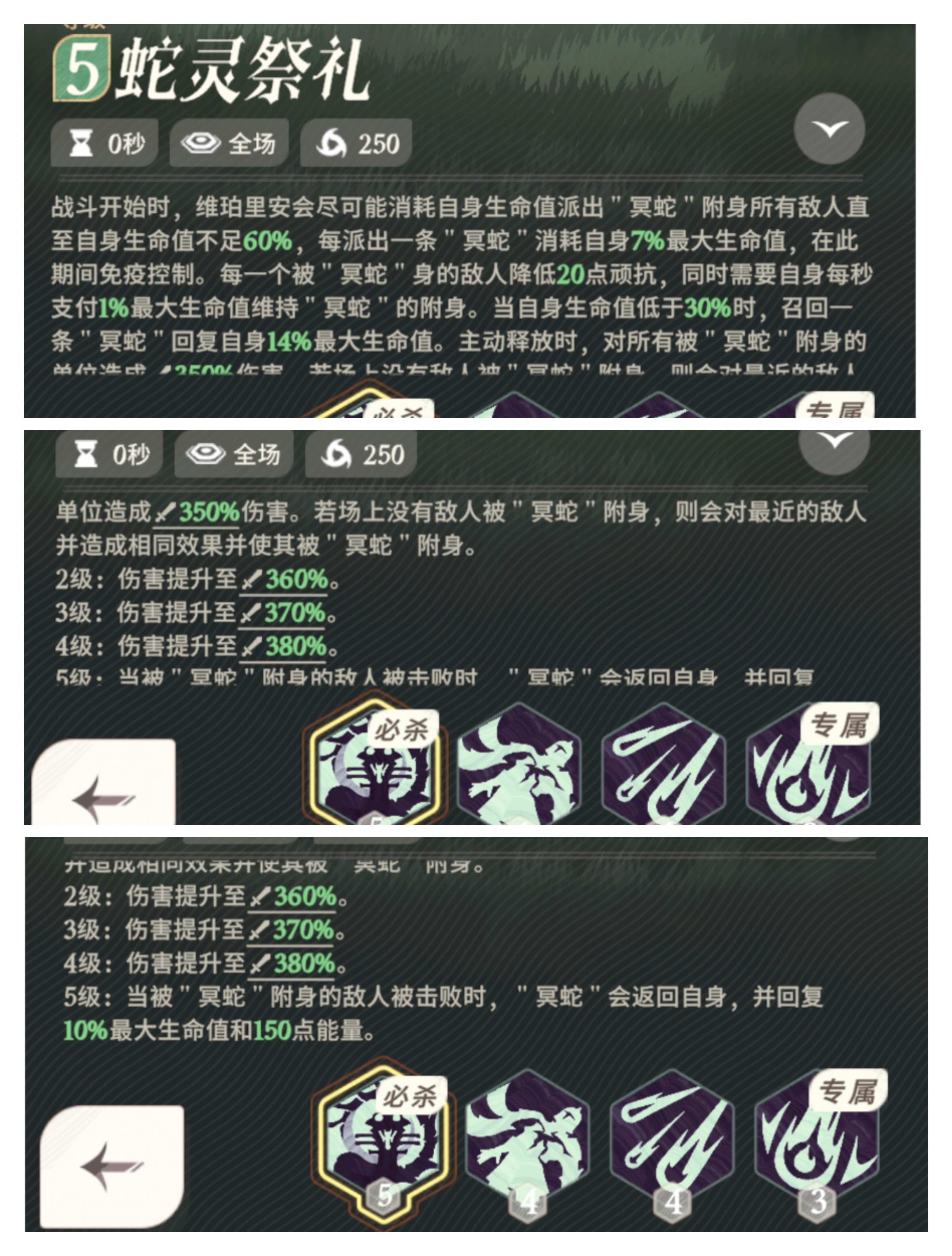 5. 随着技能的升级,蛇灵祭礼的伤害会有所提高。2 级时,伤害提升至攻击力 360%;3 级时,伤害提升至攻击力 370%;4 级时,伤害提升至攻击力 380%。
