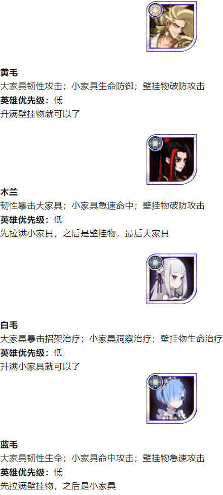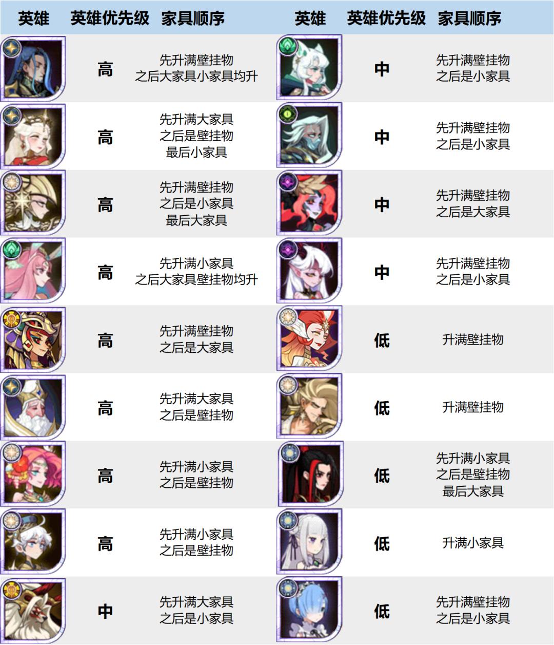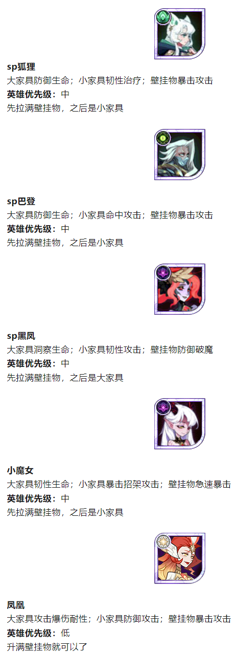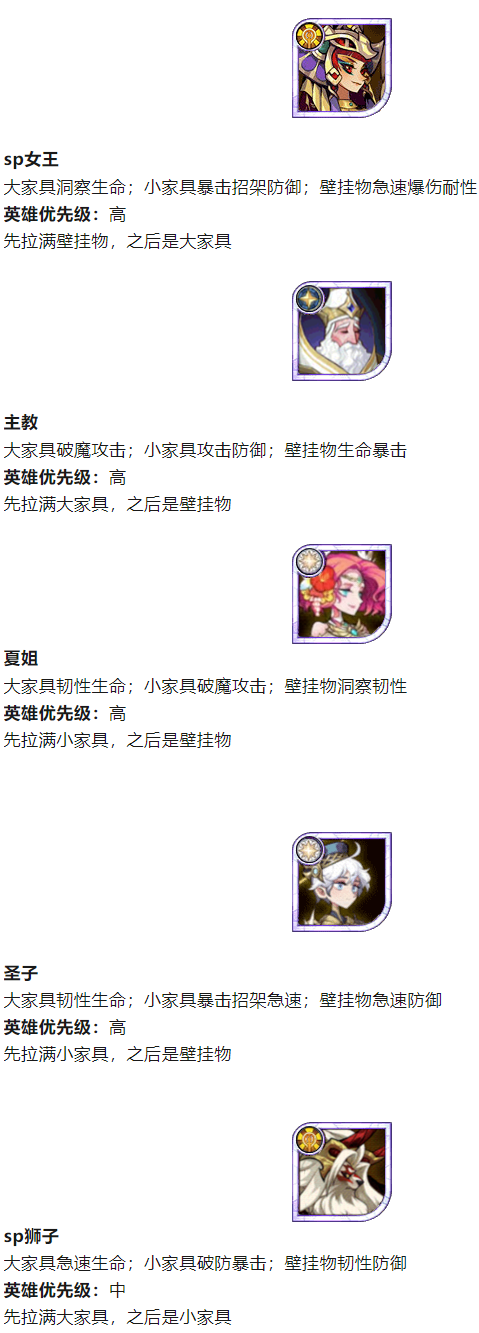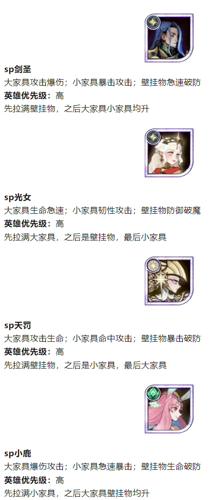 普通四族出路在何方?家具升阶相关及家具优先度推荐。剑与远征 - 攻略星发布于 2023-09-24关注所谓是,江山代有才人出,各领风骚数百年。继上次家具升阶攻略以后,随着英雄迭代,部分英雄已经难堪大任,新的英雄开始崭露头角,所以本期对家具升阶攻略进行更新。本期还是18位英雄,移出了8位原有的黑妹、虎妞、三眼和浣熊等英雄,并对凤凰、黄毛和木兰等英雄的优先级进行了降级。新增了8位新英雄如下:sp天罚、sp小鹿、sp女王、夏姐、圣子、小魔女、白毛、蓝毛,基本上都是全环境就业的英雄。英雄选择的原则是以sp为主,顶级辅助为辅的原则。家具升阶选择属性的原则还是急速优先,其次破魔破防,再次暴击爆伤,最后攻击命中等。 可以看到时至今日推荐的英雄几乎都是SP英雄和优质神魔虚空,普通四族只剩主教一人下面是英雄升阶细节: 作者:光环剑与远征小屋