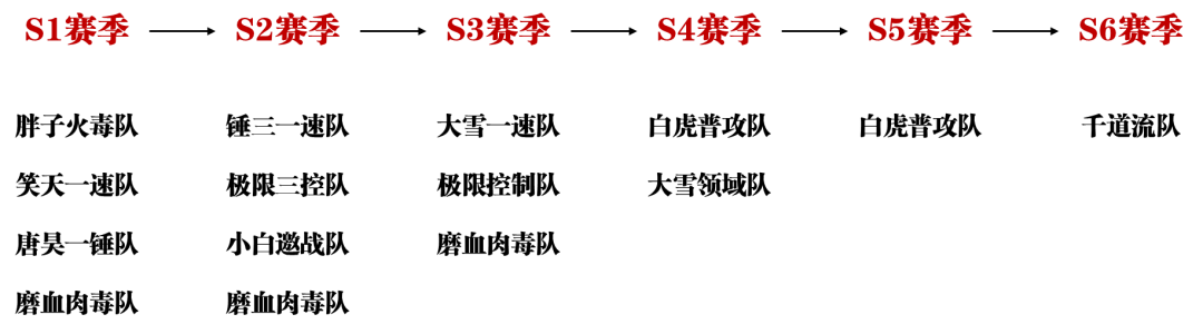 上图便是维一刚刚去找了找,过去每一个赛季我写过的全民对决阵容攻略后所总结出的赛季阵容演变图,大家从图中可以清晰的看到,S1和S2赛季的还能有不少队伍的克制关系,比如强攻一速的打法克制控制队,但却打不动肉队,但肉队又怕控制队在破被动后的暴力输出,所以这种环环相克的关系也是当时全民对决玩法能够吸引不少玩家的最大特质所在。