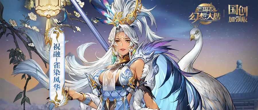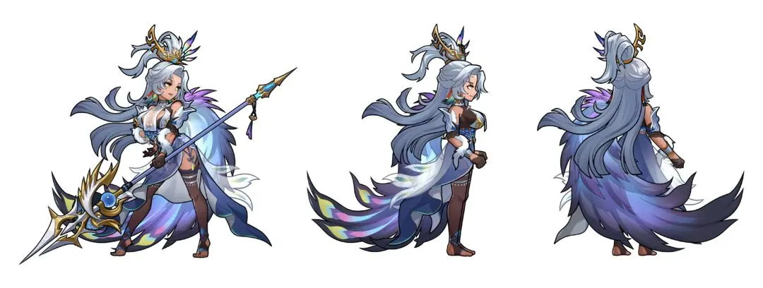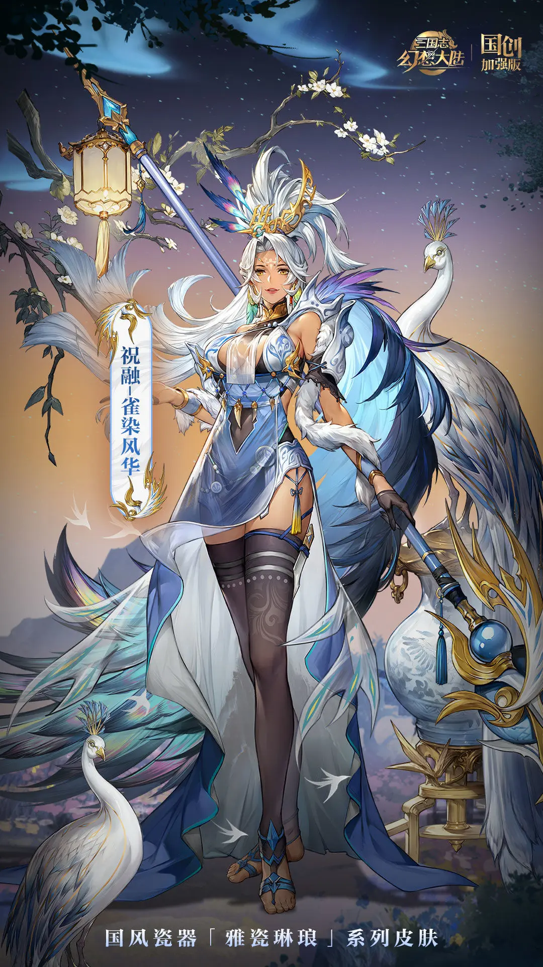 皮肤以瓷器中的斗彩为主要灵感,将青花与白作为新衣的底色,点缀艳丽的彩色雀翎,又参考南中地区对孔雀的憧憬,将模仿孔雀羽毛质感的长披风用青蓝浸染,为南方的秋天带来一抹冷色,而祝融的肤色也在青与白的衬托下更加热烈迷人。衣服以前短后长的阔摆裙为主体,露出她健美的双腿。除羽毛、兽齿、孔雀纹等部族元素,也使用了中原传统的流苏和兽面纹,象征着不同文化间的融洽交流。