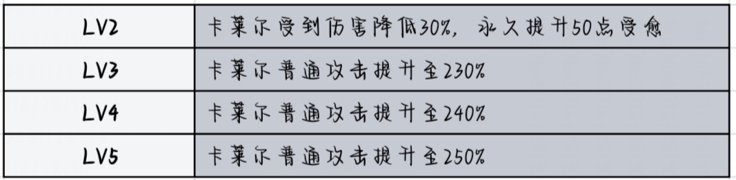 到了Lv2还会提升卡莱尔抗伤以及受愈能力大大提升了其生存能力,Lv3/4/5又一层度提升卡莱尔平A伤害,使得卡莱尔群体爆发更为猛烈,在前期体象尤为明显简直是战场终结者。