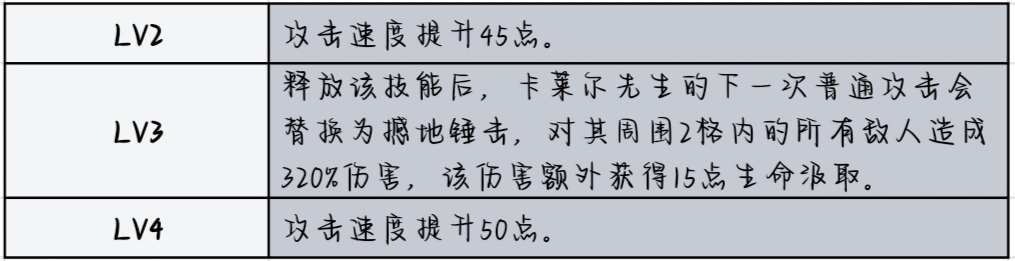 下亮点是技能升级具有进化性,除开Lv2/Lv4拉速提升,最为核心的是Lv3多了一个新技能,放技能后卡莱而也获得一个锤击大,能迅速对敌人造成320%的高额伤害,压制敌人,之后还可以汲取15点生命,在卡莱尔对续航回血的需求提供了一定的支持,小幅度稳定了卡莱尔的生存能力,增加我方爆发输出的同时为卡莱尔持续战斗打下一个底子。