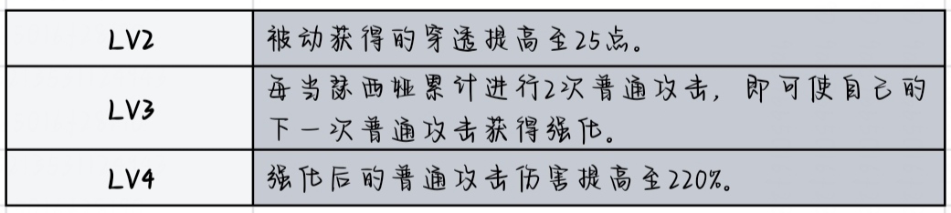 被动技,瑟西娅与卡莱尔先生获得20/25点穿透。每当瑟西娅累计进行3/2次普通攻击,自己的下一次普通攻击将获得强化,伤害提高至210%/220%。