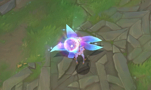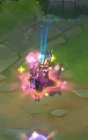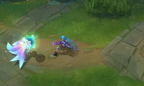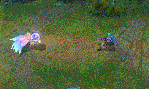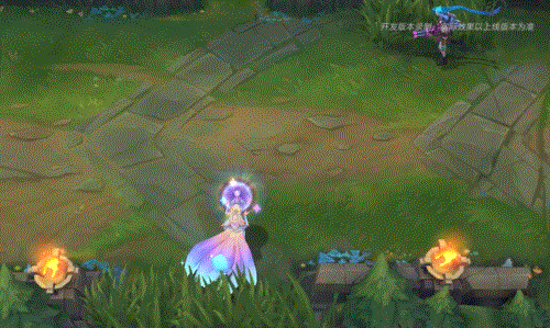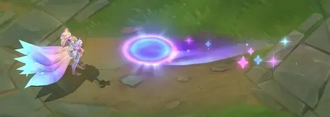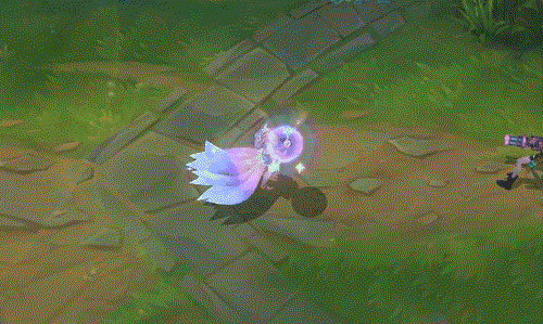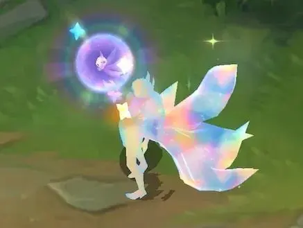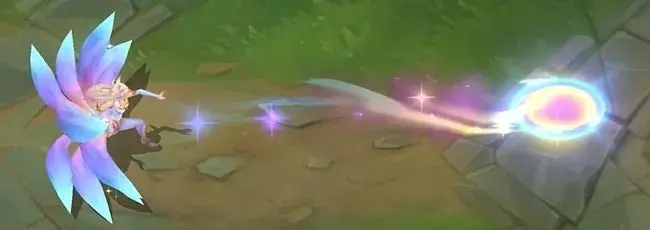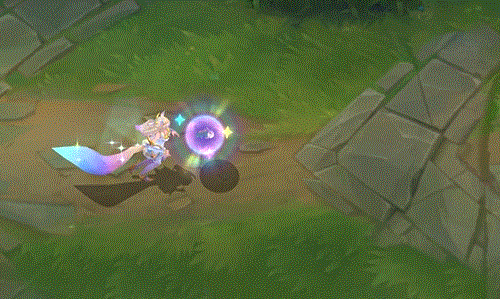 阿狸指挥有3颗星星环绕的魔法宝珠向前打击敌人,宝珠飞行时带有明亮的蓝黄色彩,返回时则变为威力更强的蓝紫色,并且会附带闪耀星星的拖尾。
