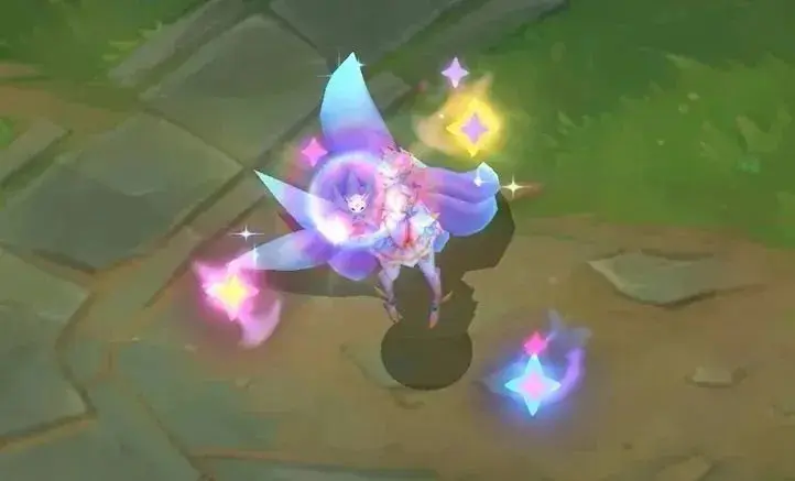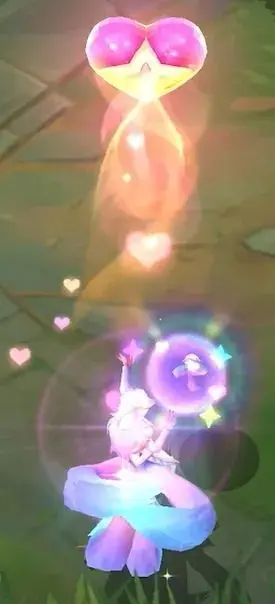 阿狸在奔赴峡谷时,她的尾巴会汇聚成一条更大、更透亮、犹如水晶般光泽的“大尾巴”,并在身后留下彩色的星星和泡泡特效。
