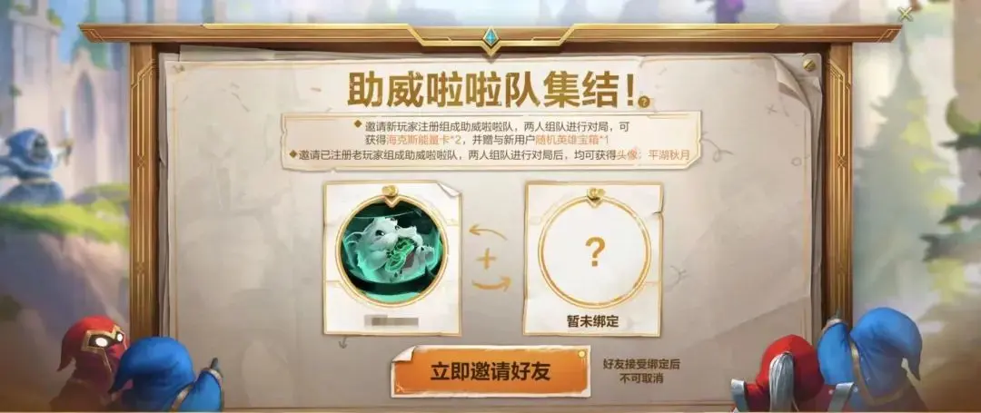 如果召唤师邀请的是未注册的新朋友,则在组队完成对局后,可获得海克斯能量卡*2,并送给队友随机英雄宝箱*1,助TA今后的峡谷之旅更加顺畅~